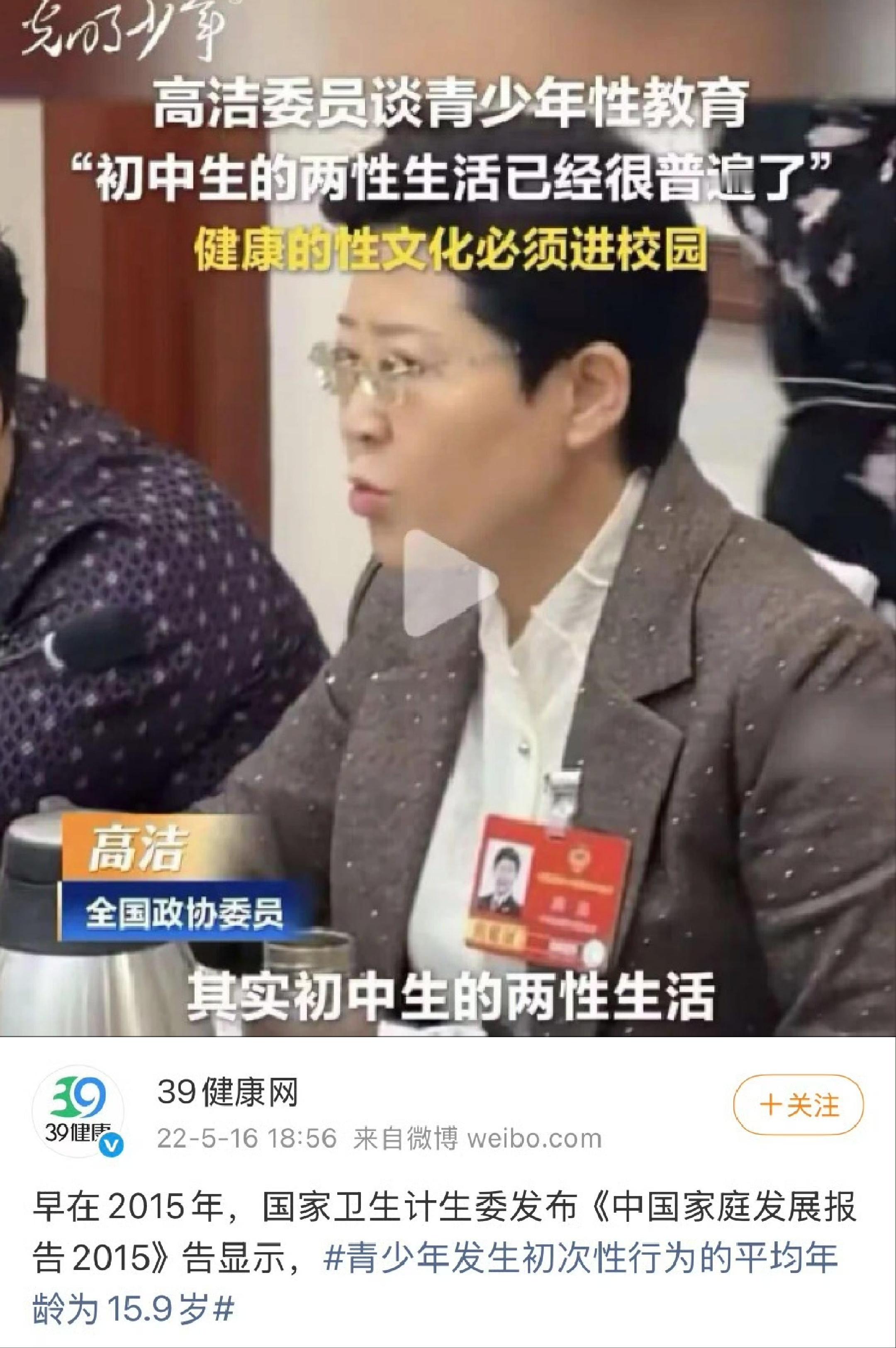 近期,高洁委员谈初中生性教育,直言“初中生的两性生活已经很普遍了”,还呼吁“健康