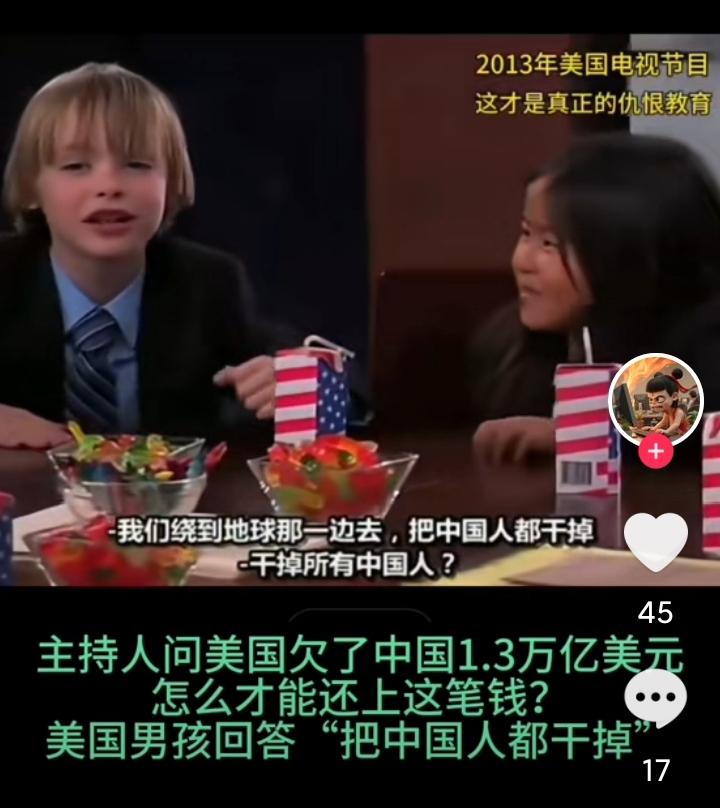 图二,这是美国一个节目,主持人问几个美国孩子,中国欠了我们1.3万亿美元,怎么办?一个男孩回答:把中国人都干掉,