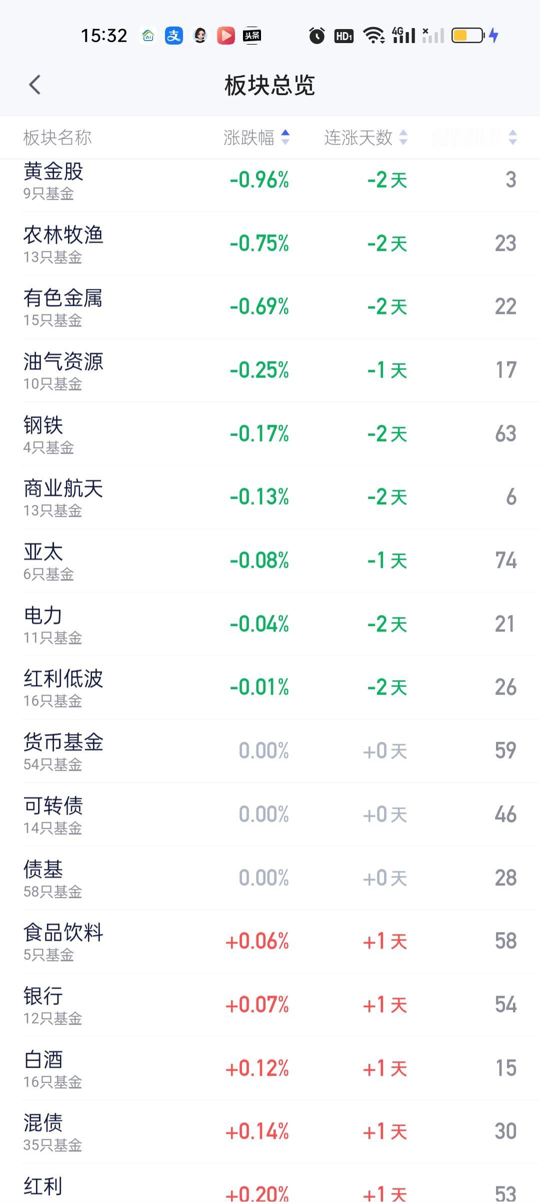 跌幅方面,今天下跌的板块并不多。而且跌幅都在1%以内。它们是黄金股,农林牧渔,有色金属,油气资源,钢铁,商业航天,亚太,电力,红利低波。