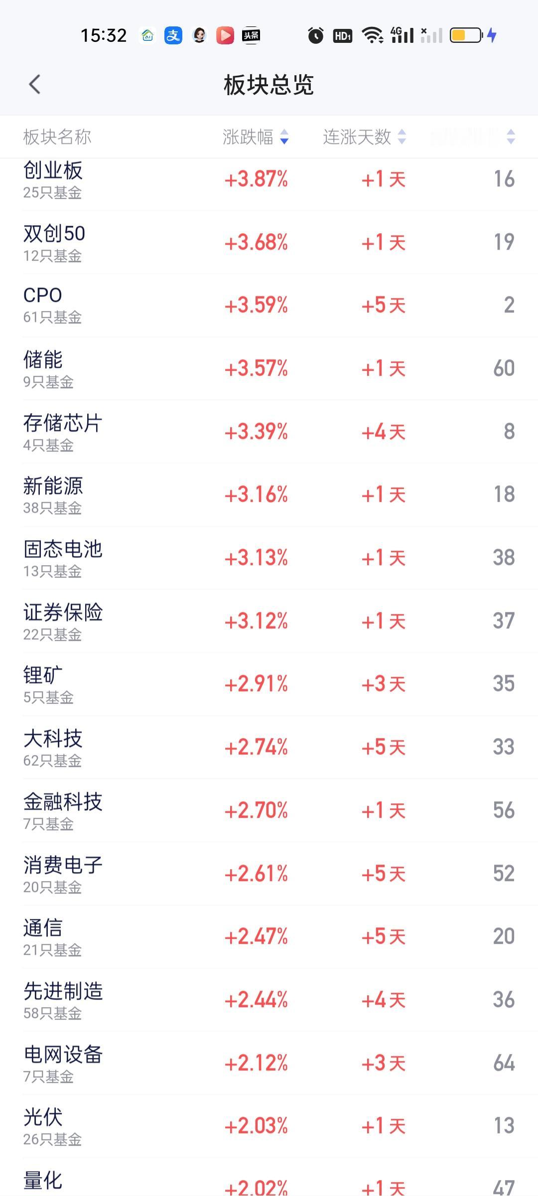 今天上涨的板块明显更多,而且下午的涨幅还在扩大,涨幅在3%以上的板块有8个,它们是创业板,双创50, CPO,储能,存储芯片,新能源,固态电池,证券保险。