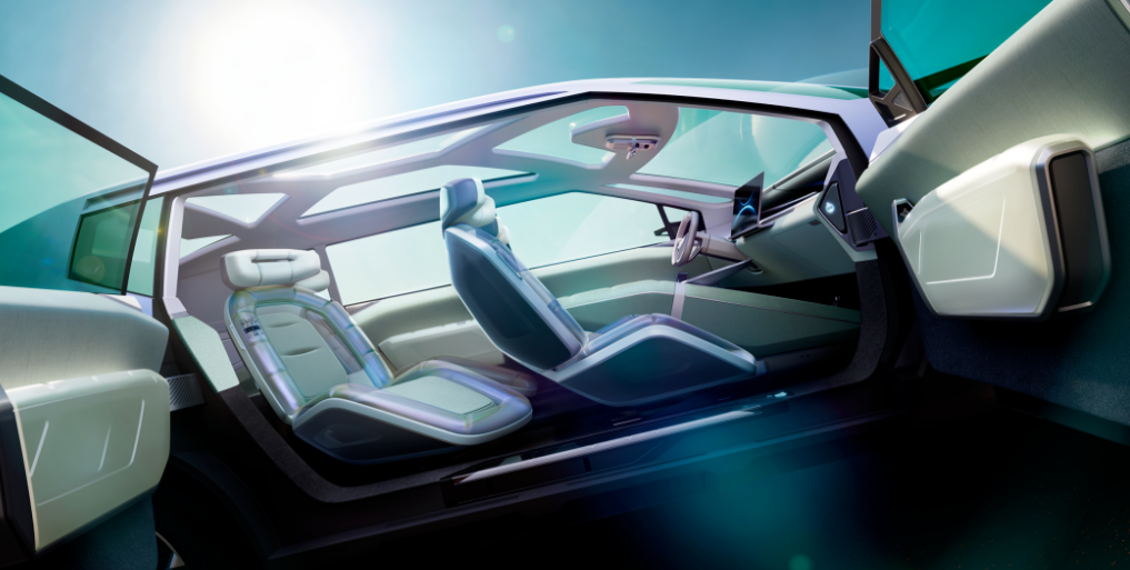 EARTH CONCEPT则定位家用纯电SUV,走的完全是另一条路——极光之盾配色、岩石质感护板、外露螺栓细节,这硬朗风格的设计,一眼就能认出是给家庭用户准备的。内饰以空气为设计主题,拥抱式座椅+树叶光影氛围灯,细节处还隐藏了北京地图图案,也是用心满满。