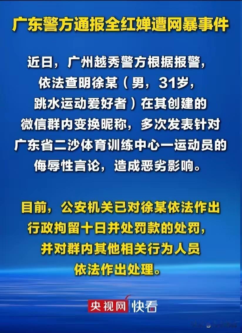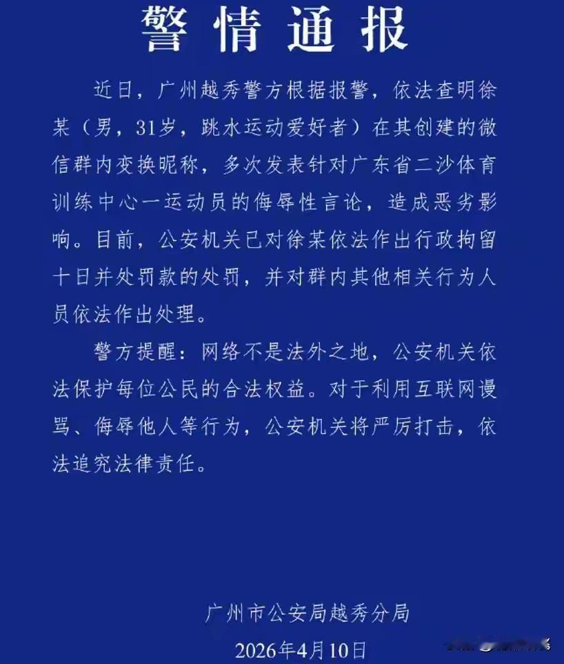 据警情通报显示,抓获男子叫徐某,31岁,是一名跳水爱好者,在其创建的微信群内经常变换昵称,多次发表针对广东省二沙岛体育训练中心一运动员侮辱性的言论。