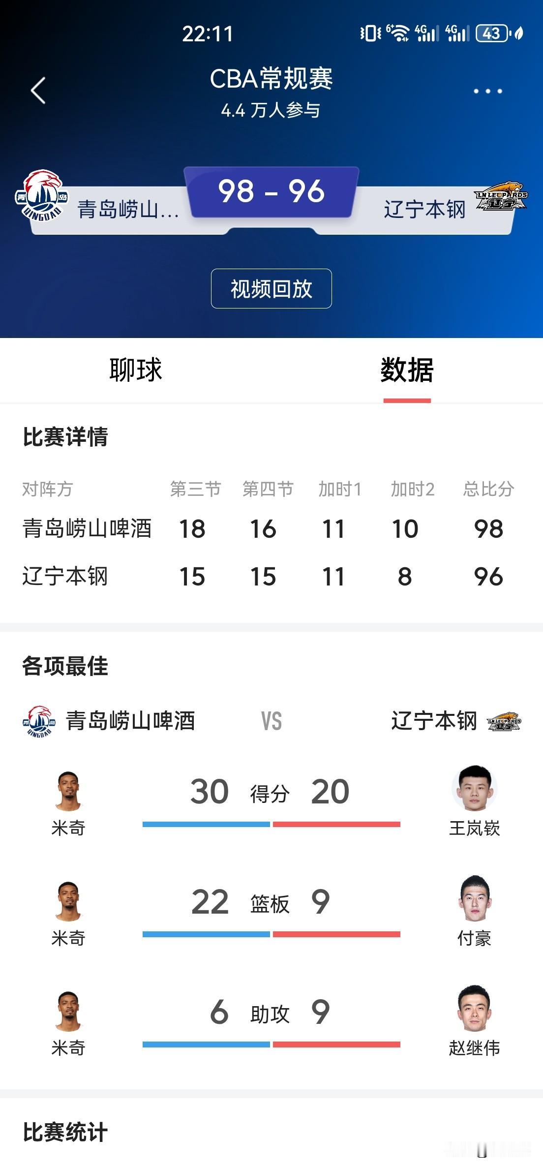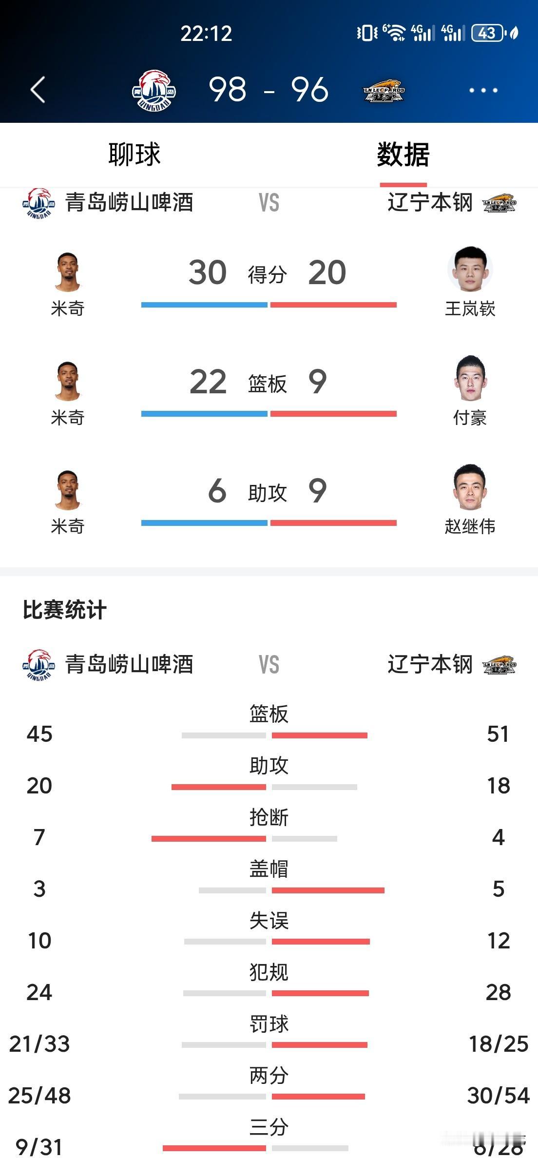 第二个加时赛最后时刻比分96:96平,辽宁队鄢手骐外线三分远投不进,青岛队后场得球快速反击,王睿泽上篮得手,比分98:96,时间还剩下6.2秒,莱迪造犯规两罚不进,辽宁队双加时憾败青岛。