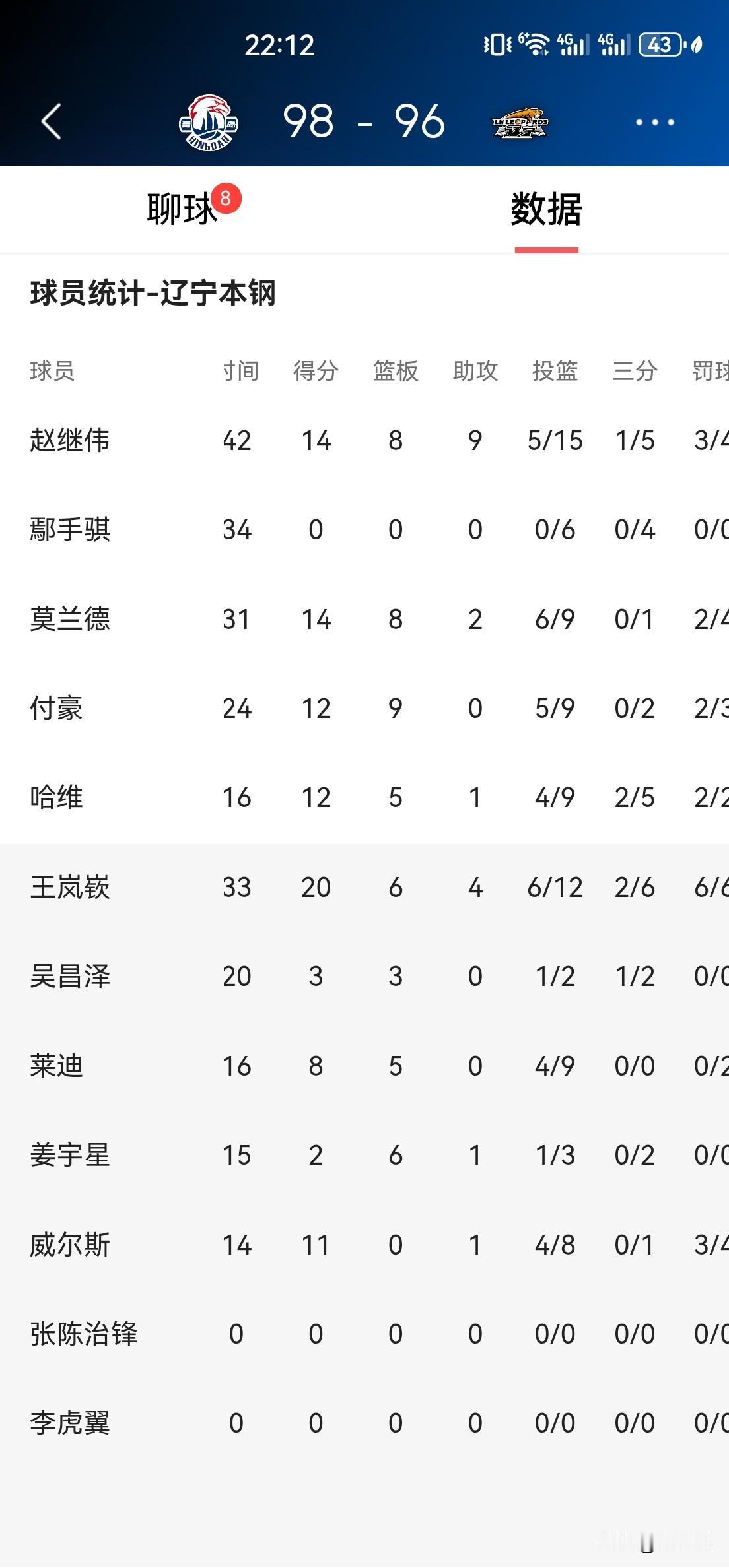 赵继伟燃尽了,辽宁双加时惜败青岛。