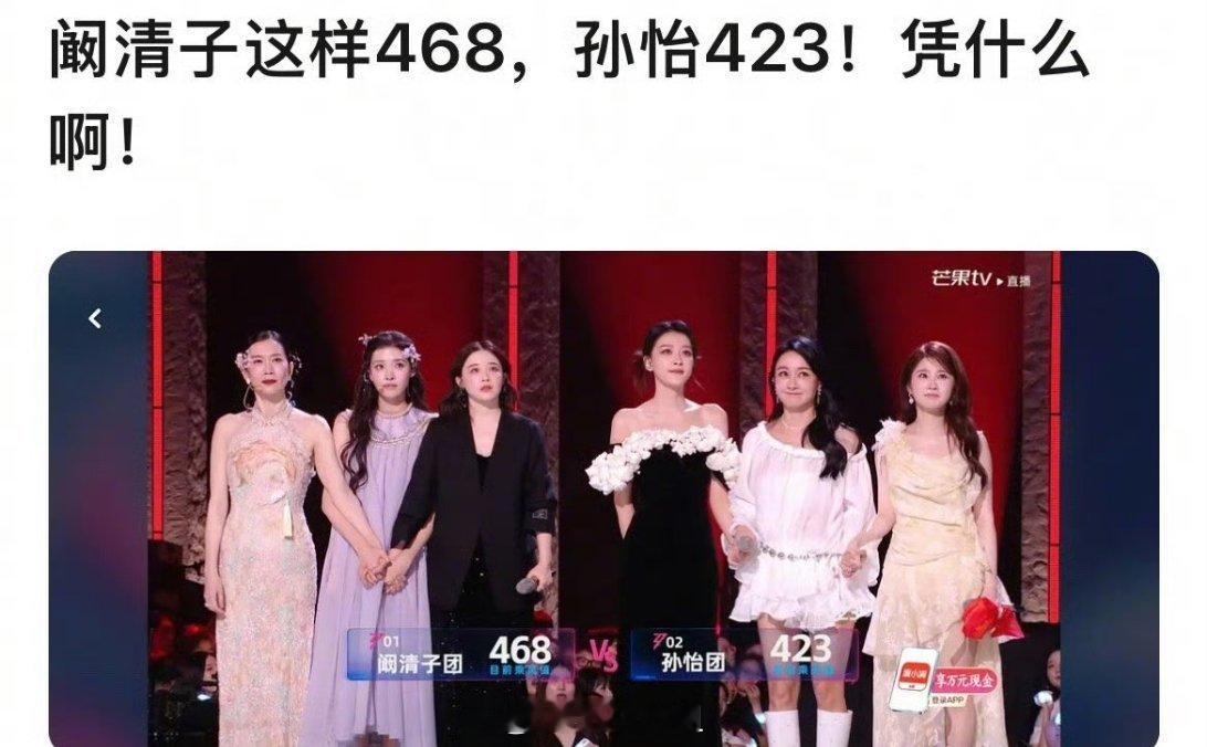 因为阚清子团队的票数比孙怡团队的票数多了四十几票,直接胜出了,结果评论区有人说孙