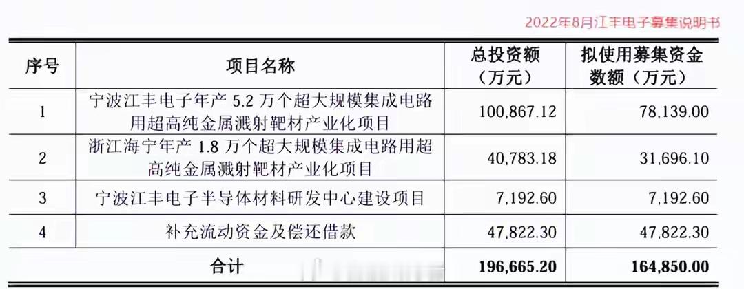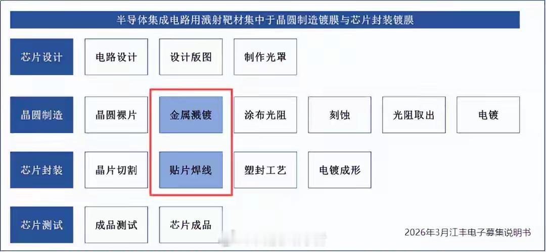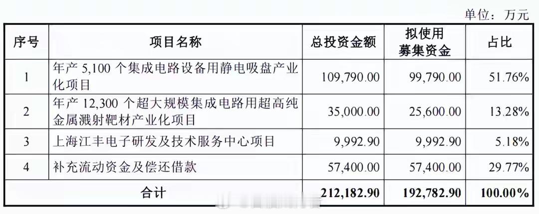 冲破垄断,江丰电子,登顶国内第一!三十年河东,三十年河西!2000年,国内晶圆产能仅占全球产能的2%;2010年这一数据增长至9%。据预测,2025年国内晶圆产能有望达到1010万片/月,占比接近三成,攀升至全球第一。全球晶圆产能的转移,背后是国内半导体产业的稳步前行。这个过程中,少不了中芯国际、北方华创、南大光电和江丰电子等半导体厂商的努力。从时代变迁聚焦到企业发展缩影,江丰电子用自己的两次大规模扩产,交上优秀答案!首次扩产:聚焦国产替代翻看2022年8月江丰电子的募集说明书,不难发现,公司拟募资的16.49亿元中,有约11亿元用于金属靶材项目的产业化建设。对“溅射靶材”一词,不少人可能比较陌生。晶圆设计、制造和封装三大环节中,靶材在后两个环节中均有重要应用。晶圆制造过程中,溅射靶材用于导电层、阻挡层等部分的制备;封装环节中,超高纯金属溅射靶材则被用于贴片、焊线的镀膜封装处理。铝靶纯度要求在99.9995%(5N5)以上,半导体用铜靶及铜合金靶纯度要求在99.9999%(6N)以上,技术壁垒极高。如果将芯片制造,比作在晶圆上画立体图像,溅射靶材被轰击后形成的薄膜,就是整幅作品中不可或缺的洁净“画布”。而靶材下游需求,又直接受芯片产量变化的影响,当下晶圆厂扩产和半导体国产替代,变相加速了靶材产能释放。预计2023-2027年,全球半导体溅射靶材市场规模从147亿元增长至251亿元。这,也是江丰电子斥资14亿,扩产溅射靶材的原因。一方面,头部晶圆厂和客户持续扩产。公司成为中芯国际、台积电、SK海力士、京东方等国内外多家大厂的溅射靶材供应商。台积电于2026年1月宣布,上调本年资本开支计划至520亿—560亿美元,有望增加两个先进封装厂计划。另一边,预计国内12英寸晶圆厂数量,将从2024年的29座,增长至2027年的71座,带动靶材用量提升。江丰电子本次三个建设项目可使用状态的日期,基本在2025年底,公司此前快人一步扩产,现下恰好承接各大晶圆厂的产能抬升期。另一方面,国产替代进行时。回顾过往数据,2022年溅射靶材国产化率约20%,仍有较大提升空间。经过江丰电子持续努力,近年来,公司在全球半导体靶材领域市占率超25%,大大加速国产替代进程。鲜为人知的是,江丰电子2005年成立之初就承接863计划,研发出第一块国产溅射靶材,成功打破垄断。公司创始人姚力军及多名管理层核心人员,均为技术出身,对靶材产品理解深刻。除了扩产,在一体化布局和产品性能升级这块,江丰电子也下足了功夫!向上游,公司通过控股或参股的方式,深度绑定同创普润(高纯铝、铜、钽)、创润新材(高纯钛)和创欣新材料等原材料公司。向下游,江丰电子投资芯丰精密、六方半导体等企业。另外,江丰电子超高纯金属建设靶材,已批量应用于7nm、5nm节点芯片制造,而且进入高端3nm产线。据业绩快报表述,2025年公司实现营收46.05亿,同比大增27.75%,实现净利润4.81亿,同比增长20.15%,实现双料增长。所以,2022年的募资扩产对江丰电子而言,既顺应了行业变化,也符合自身发展的需要。二次扩产:布局新业务、剑指全球化第二次募资扩产,江丰电子有何意图呢?2025年12月,公司再次发布募集说明书,拟募资不超过19.28亿元,用于补充流动资金、偿还借款以及相关项目的建设。此次扩产,仍有溅射靶材的身影。但投资金额和设厂地点,却与上次有很大不同。本次年产1.23万个靶材项目的建设地点在韩国庆尚北道龟尾市,总投资额在3.5亿,与上次相比有所减少。韩国基地的扩产,主要是实现对SK海力士、三星等重要客户的覆盖,提升公司属地化服务能力,进而加速全球化布局。这次的募投项目中,还多了个新面孔——静电吸盘。公司拟投入约11亿元的金额,用于年产5100个静电吸盘项目建设。静电吸盘,是刻蚀、PVD、CVD、离子注入、EUV等核心设备的必选部件。国内晶圆厂零部件采购中,静电吸盘价值占比在9%,价格整体较高还是高频耗材。国内结构型钣金件、功能腔体等金属件产品,国产化率超过50%,但静电吸盘自供率尚不足10%。2025年1月,江丰电子与韩国KSTE INC签署《关于静电吸盘项目之合作框架协议》,引进静电吸盘技术并采购相关生产设备。同时,公司也完成部分静电吸盘样品的独立自研,通过“引进+自研”双重策略,进军新领域。不仅如此,公司零部件产品在气相沉积、光刻、刻蚀和氧化扩散等工艺中,得到广泛应用,可量产气体分配盘、Si电极等4万多种零部件,形成全品类零部件覆盖。2025上半年,江丰电子精密零部件业务实现营收4.59亿。不得不说,江丰电子布局精密零部件业务可行性很高。一方面公司在精密制造领域,技术积淀充分;另一方面,精密零部件产品能承接公司在溅射靶材处积攒下的客户资源。2025年,全球半导体精密零部件产品市场规模约4288亿,2027年有望达到5428亿。庞大市场规模下,倘若公司半导体零部件增长速度较快,后续有望出现与靶材业务分庭抗礼的局面。无疑,此次募资扩产,既帮助公司布局新业务,也是加速其全球化进程的有力推手。写在最后2020年来,光刻胶、电子特气、溅射靶材等半导体材料国产化率稳步提升,背后少不了江丰电子这种专注自主研发企业的身影。功夫不负有心人,近几年营收的稳定增长,便是对公司兢兢业业经营的最好回报。黄金A股
