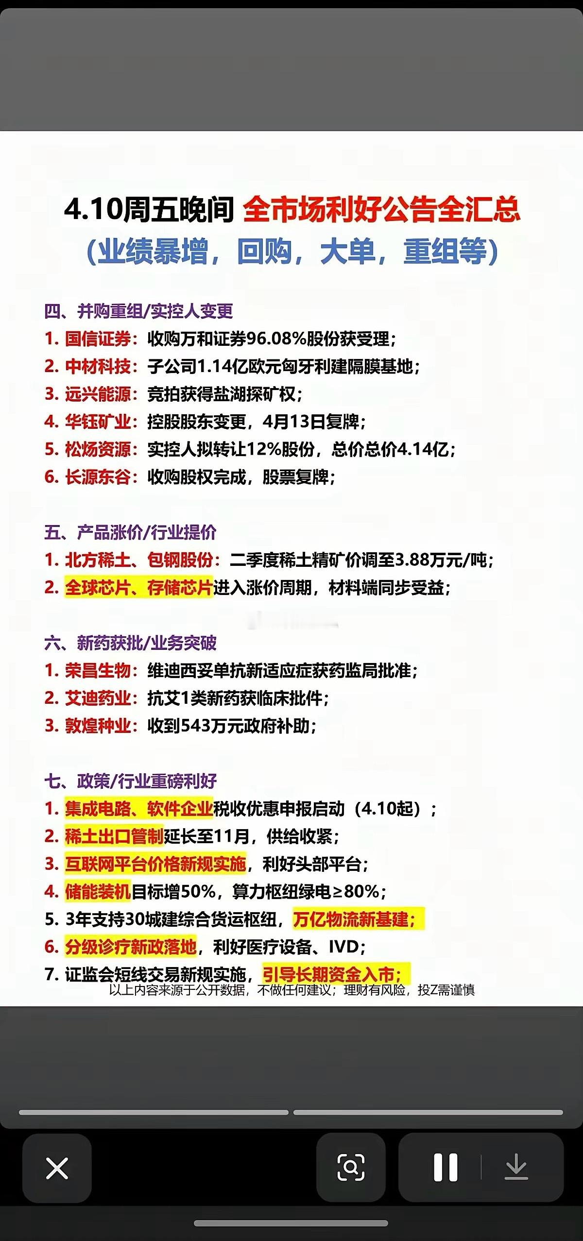 周末大利好!业绩炸裂+政策红包,下周这些方向要起飞?4月10日周五晚间,A股市场迎来重磅利好轰炸!从“业绩暴增”到“政策红包”,再到“并购重组”,三大主线清晰浮现,为下周行情埋下伏笔。一、业绩“核弹”:资源、科技、券商集体爆发- 天华新能一季度净利预增超275倍,富春染织预增超13倍,保变电气预增超12倍,业绩炸裂引爆眼球!- 中矿资源(+271%~308%)、中稀有色(+217%~281%)等资源股业绩兑现,叠加稀土出口管制延长、精矿涨价,周期行情有基本面支撑。- 中信证券一季度净利102亿(+54.6%),中金公司、中信建投均预增50%+,券商龙头业绩大增,指数“定海神针”作用凸显。二、政策“红包”:半导体、稀土、储能迎利好- 集成电路、软件企业税收优惠重启,直接利好半导体产业链;- 稀土出口管制延长至11月,供给收紧叠加涨价,稀土板块再迎催化;- 储能装机目标增50%、算力枢纽绿电≥80%,新能源赛道政策加持明确。三、资金信号:主力调仓指向“高低切换”周五午盘数据显示,资金从光通信(CPO)高位板块撤离,大幅流入大金融(中信证券+11.4亿)、AI硬件(立讯精密+12.38亿)、新能源(国轩高科+9.96亿)。结合周末利好,下周资金或继续聚焦“业绩确定+政策催化”的方向。风险提示奥瑞金一季度净利预降13%~32%,需警惕业绩不及预期风险。A股周末利好