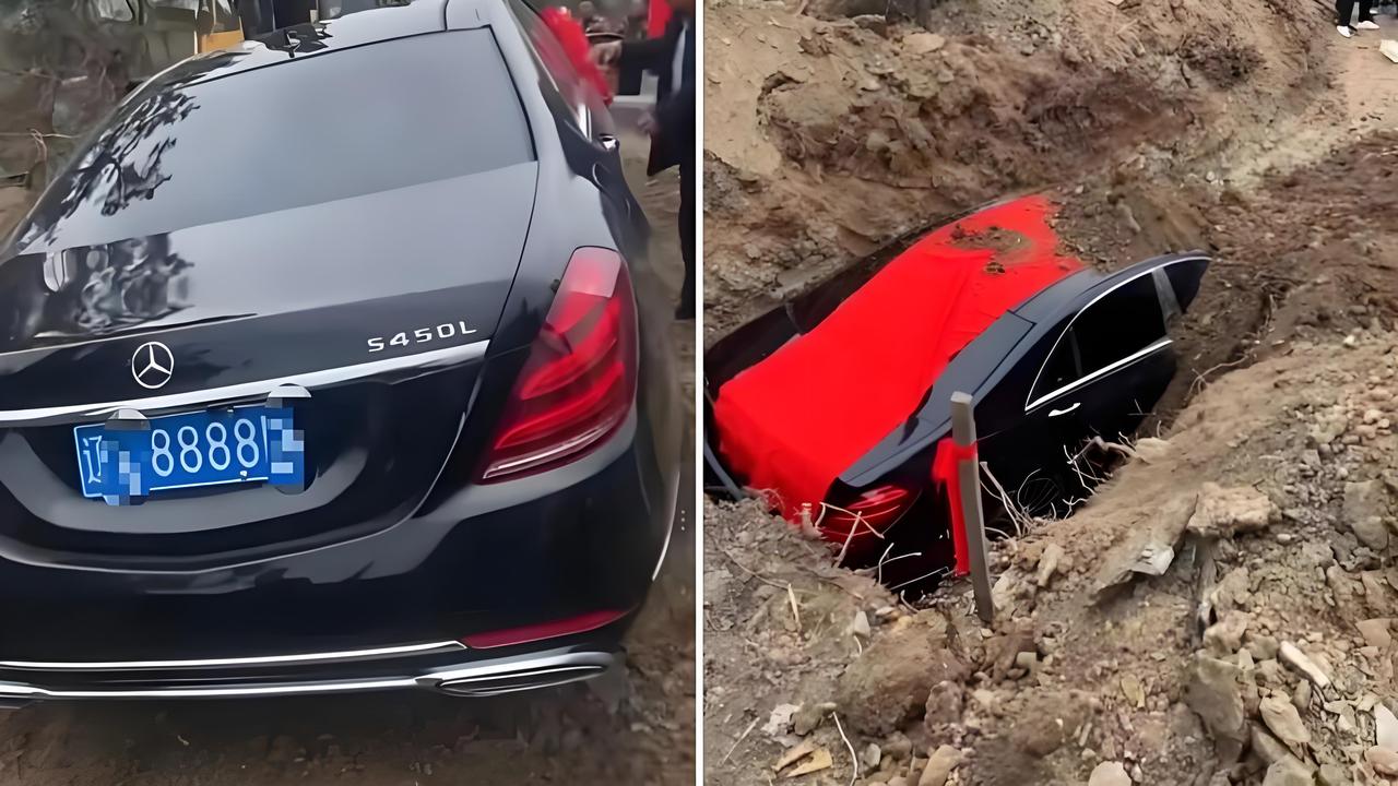 辽宁辽阳一辆悬挂“8888”靓号的百万奔驰豪车,竟被强行当作陪葬品入土!