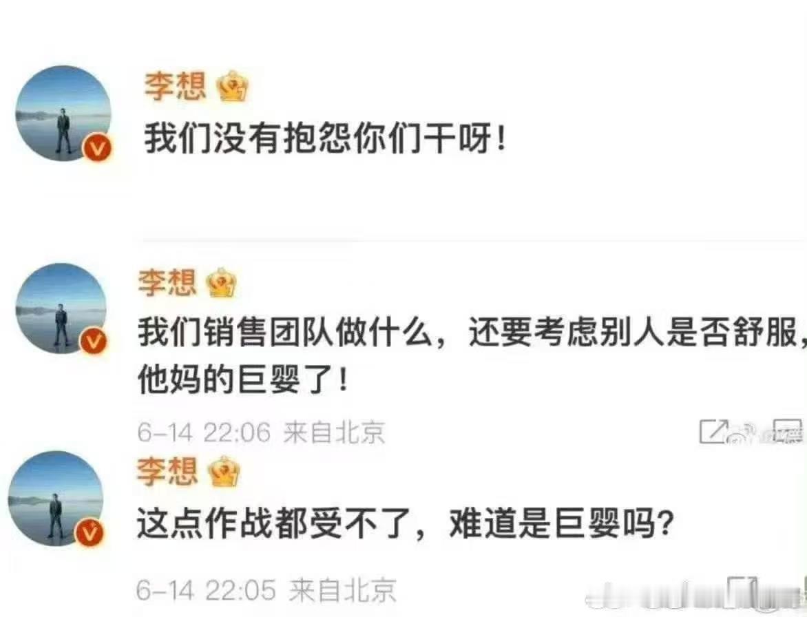 这点作战就受不了了,难倒是巨x嘛?自己说的话回旋插自己身上了李想朋友圈飙脏话李想