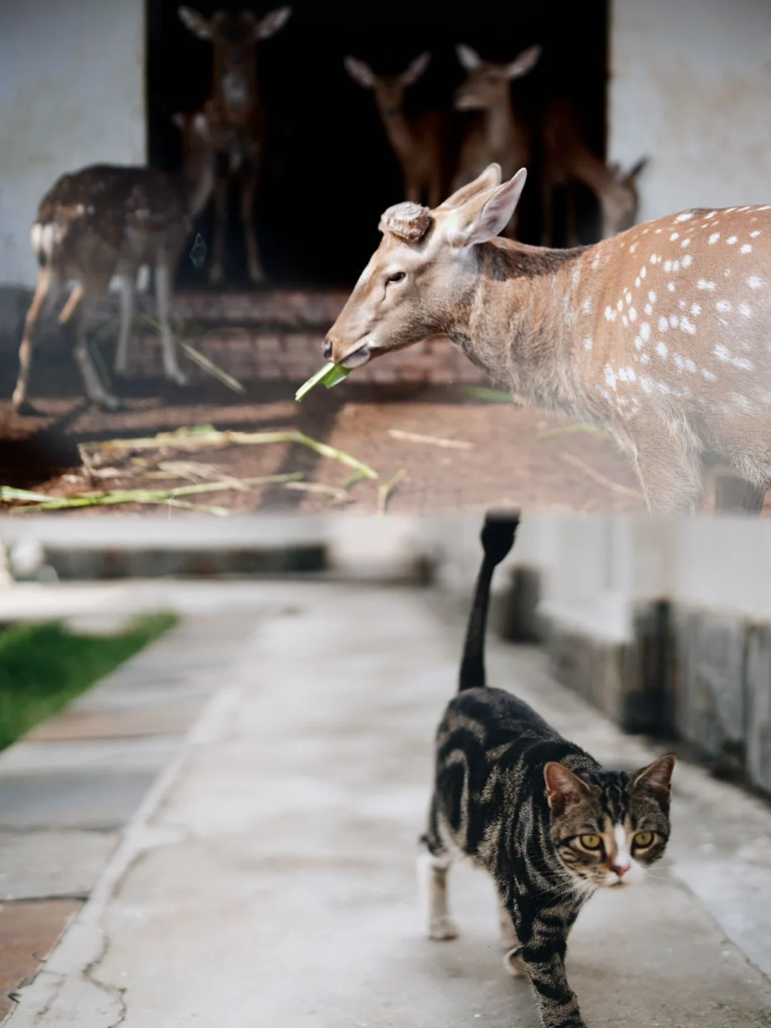 梅花鹿换上了浅棕色的夏毛,在刚返青的草坪上散步。你蹲下来,它们就会凑过来——温热的鼻息蹭着掌心,心都化了。