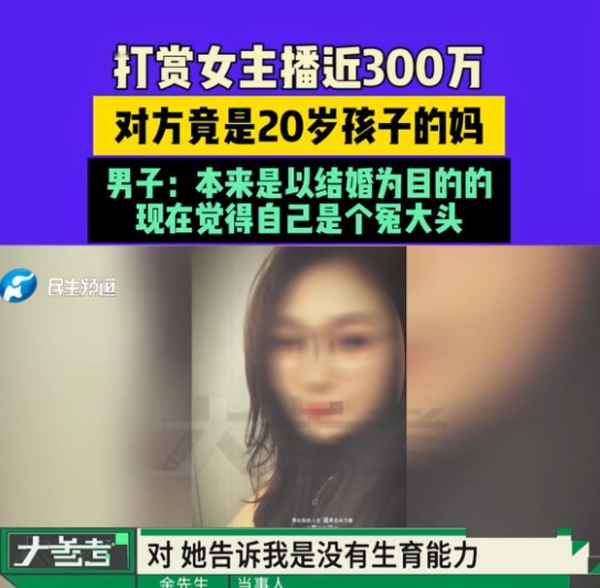 余大哥当时是奔着结婚去的,满心欢喜地规划着两人的未来,觉得自己付出这么多,总能抱得美人归吧?结果万万没想到,偶然间听人一说,他得知了一个惊天大秘密——自己深爱的这位女主播,居然早就结婚了,而且女儿都已经20岁了!都能当他小侄女了!