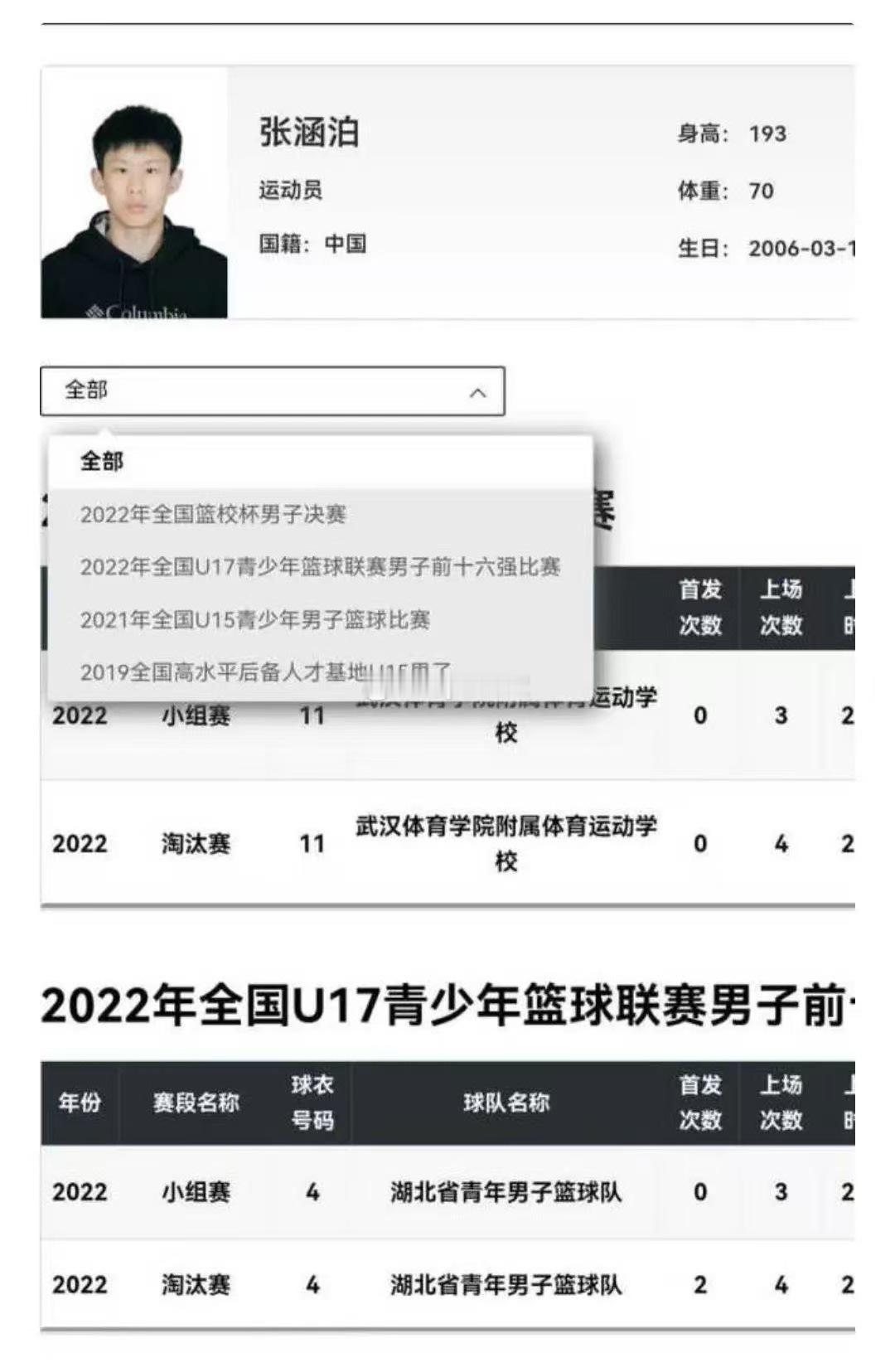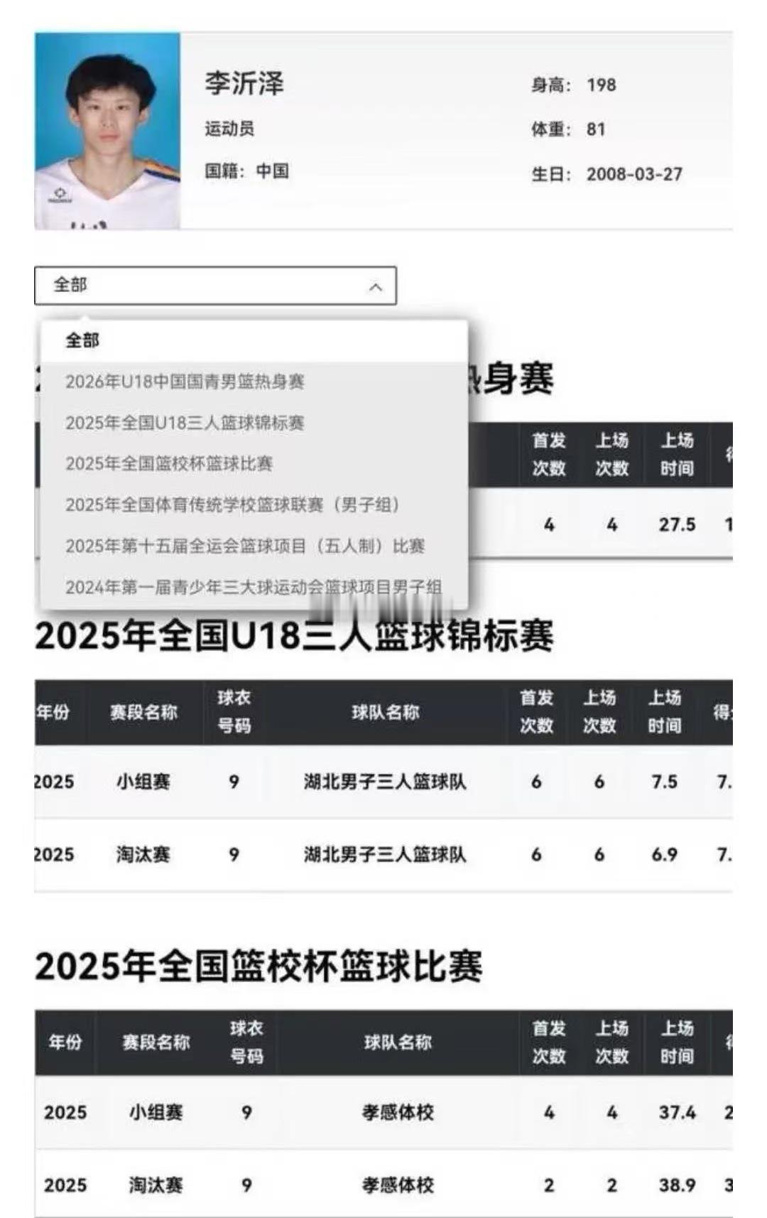 李沂泽之前默默无闻,但是今年突然就成为这届U18的外线核心,而且身体素质劲爆,所以就有人开始摸他的底细,这一摸不要紧,直接从官网上找到了两份资料(图一图二),照片模样是同一个人,但是年龄相差2岁,姓氏和名字完全不一样,很多人就拿此作为铁证来证明他改年龄实锤了。