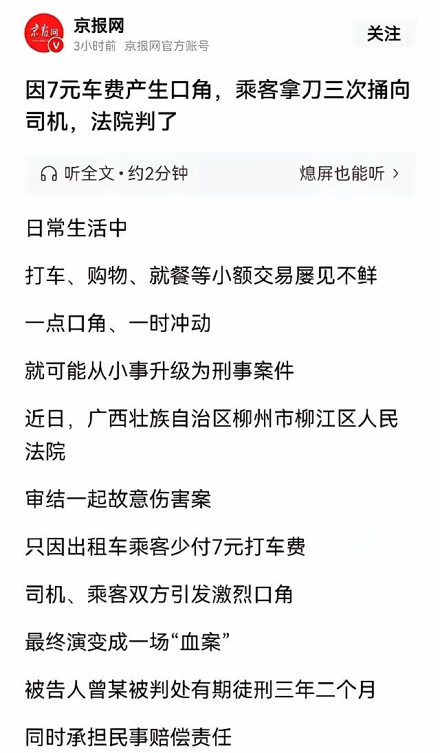 整件事从头至尾,都没有不可调和的矛盾,核心矛盾仅仅是7元车费的支付问题,这点钱在日常消费中微不足道,却因为曾某的情绪失控、漠视法律,彻底改变了两个人的人生轨迹。