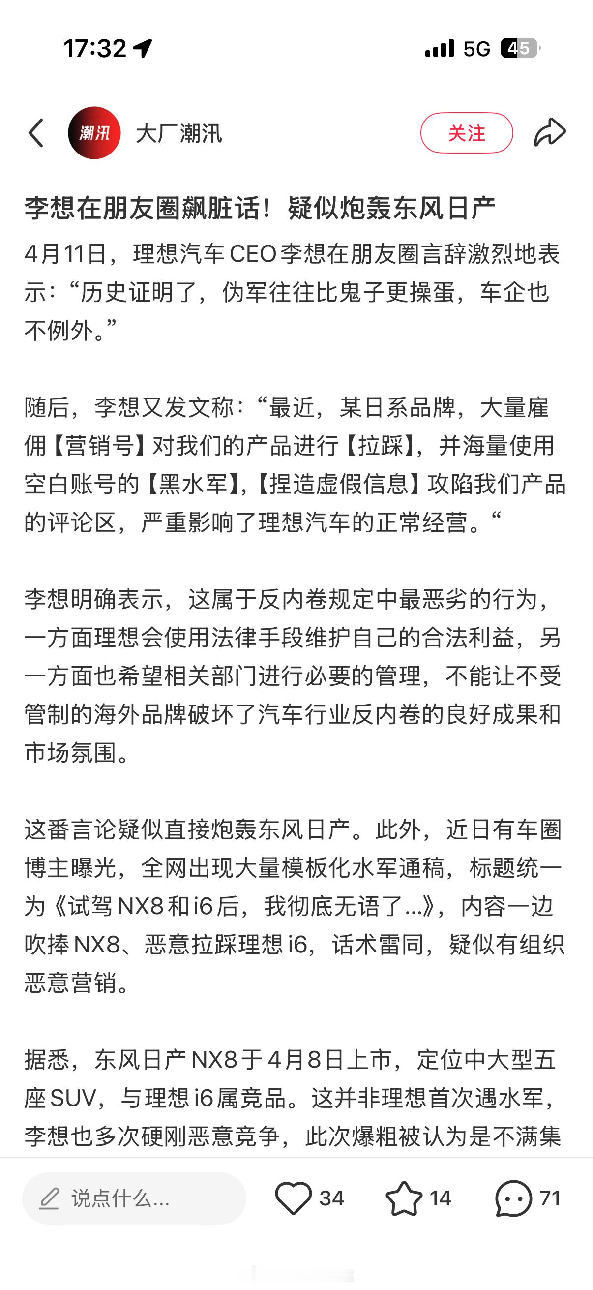 李想朋友圈飙脏话虽然没指名道姓,但结合最近上的日系新车,明眼人一看也知道暗指的是
