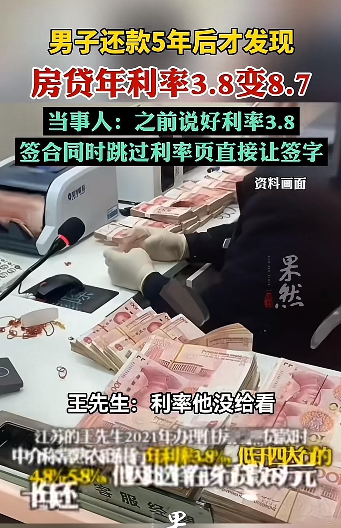 江苏无锡王先生还贷5年后惊掉下巴,房贷年利率从承诺的3.8%变成了8.7%。2026年2月他打算提前结清68万房贷,还款明细单上“8.7%”的年利率让他当场愣住。原来,五年前中介和银行经理口头承诺的是3.8%。经多次索要和调解,在媒体介入后银行才拿出合同,上面写着固定房贷年利率8.7%。这五年,王先生比按3.8%利率多付超10万利息,若到合同到期,总利息差额近20万。他的发现很偶然,要不是提前还款打印流水,可能一直被蒙在鼓里。签合同可得仔细,别像王先生一样跳过关键页,吃了大亏。