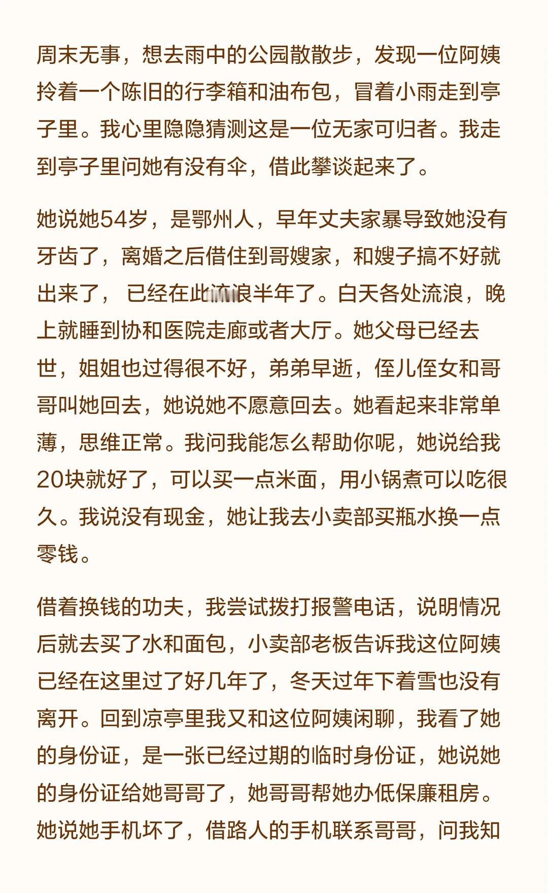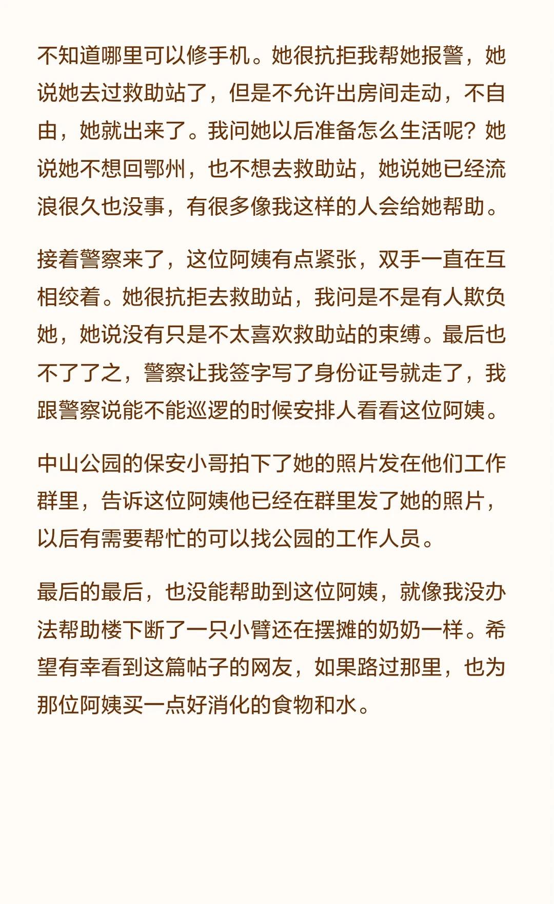 一位54岁的鄂州阿姨因生活困难在外流浪,她不愿回娘家,也不愿去救助站。我帮助她买了水和面包,并联系了警察和保安,希望有人能提供长期帮助。希望有人路过时能为她提供食物和水。中山公园