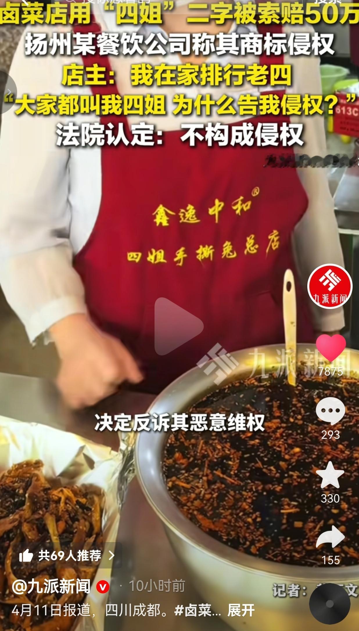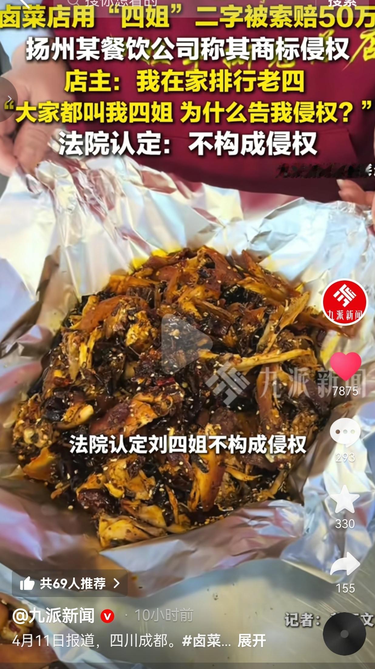笑疯又解气!就因为招牌用了“四姐”俩字,成都开了10年卤菜店的老板娘,居然被扬州一家公司告了,张口就要50万赔偿!结果老板娘一句话直接把对方问懵,法院一判:不构成侵权!这波真的太解气了!