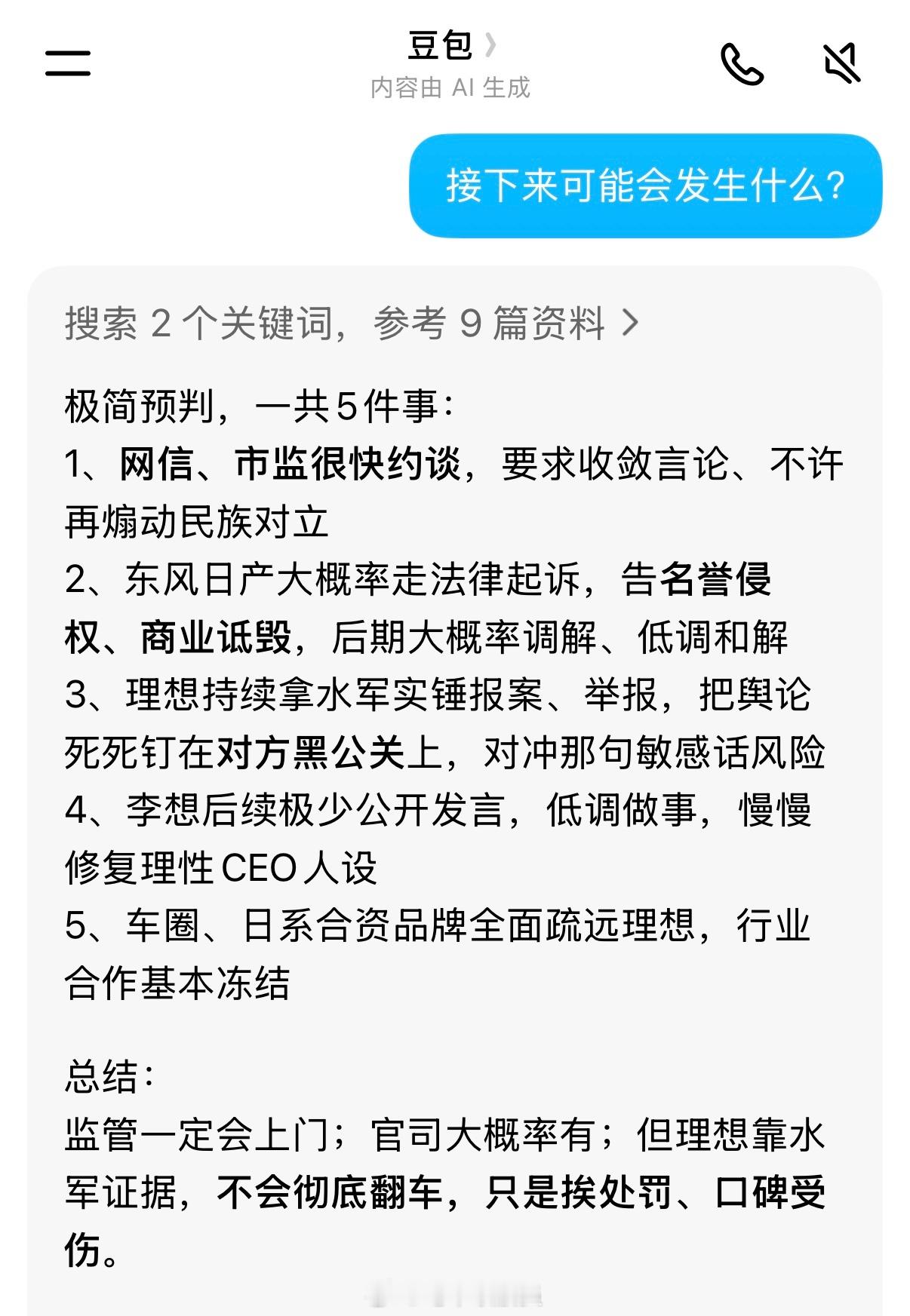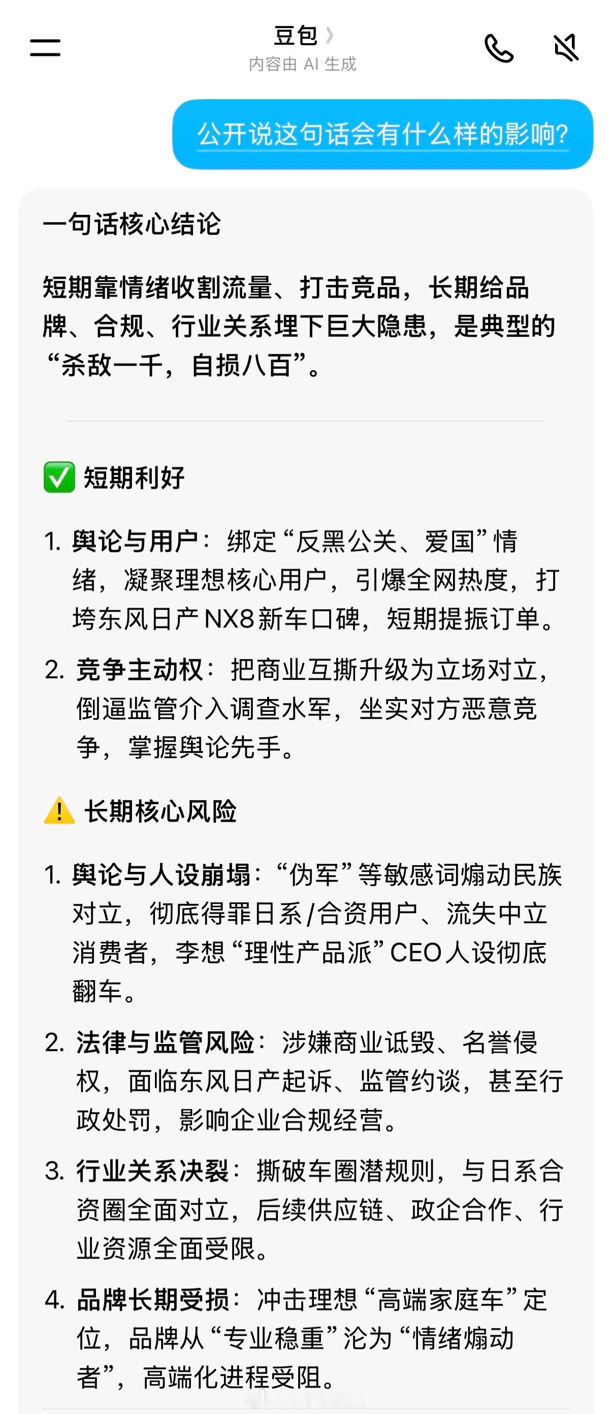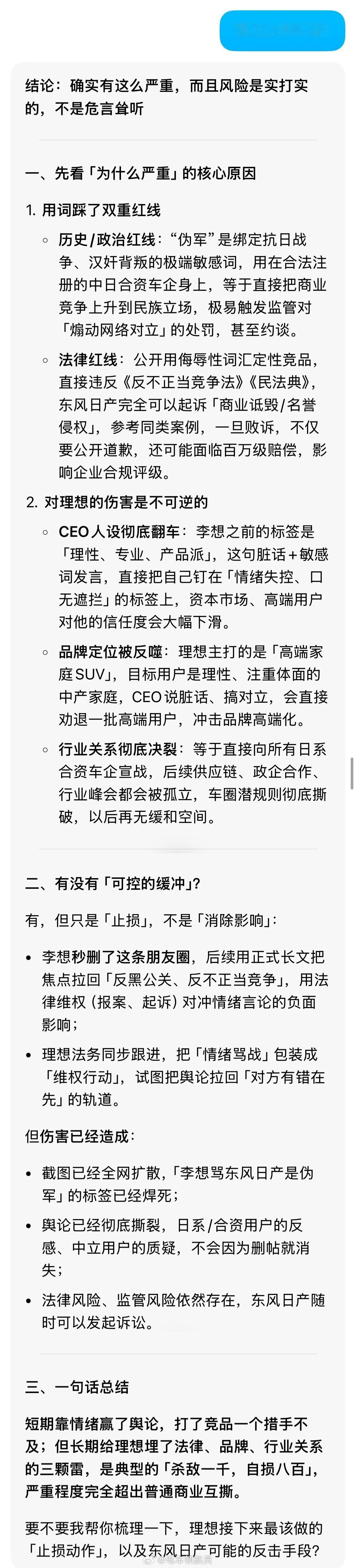 (提问时语言极简,AI根据初始截图生成内容,非个人观点)李想朋友圈飙脏话东风日产高管回应李想喊话李想朋友圈再发文李想发文称某品牌持续拉踩
