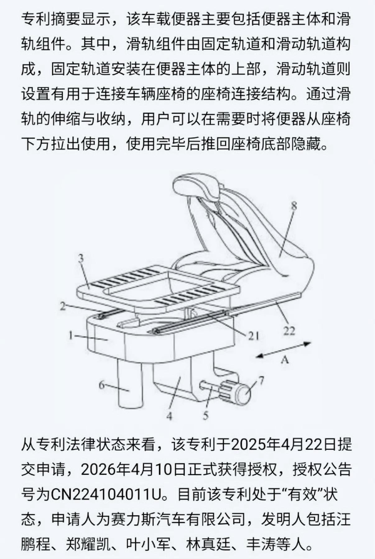 留给车企的新功能真不多了,赛力斯申请的“车载便器及车辆”实用新型专利于4月10日正式生效。