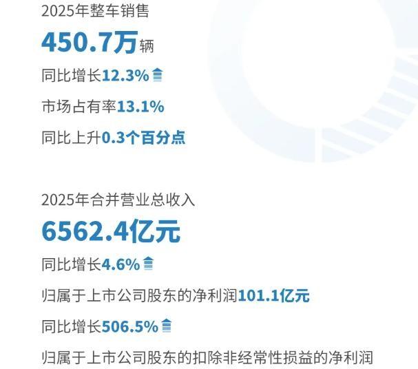 2024年上汽确实惨,销量掉到401万辆,净利润只剩16.7亿。到了2025年,销量反弹到450.7万辆,净利润101个亿,看着像从ICU直接进了KTV。但你细看就发现,2024年利润基数本来就低得离谱,扣非后还亏了54亿。从亏54亿到赚101亿,增幅当然吓人,这就像你月考考了0分,下次考了50分,进步了500%,但离及格还远着呢。