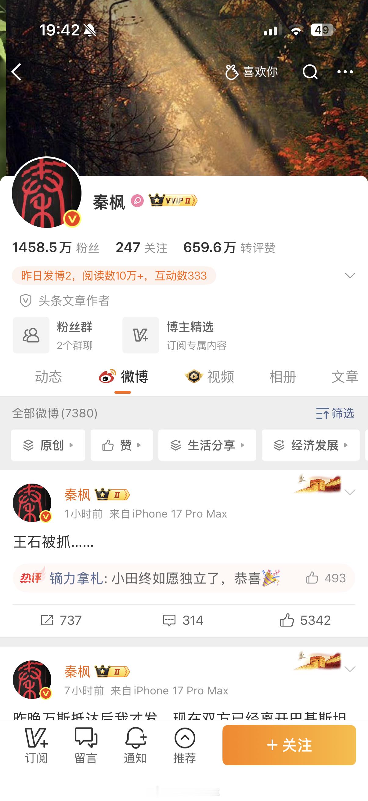 田朴珺回应网传王石被抓王石本人回应了…秦枫的微博还在互联网吃瓜就是得让子弹飞一会