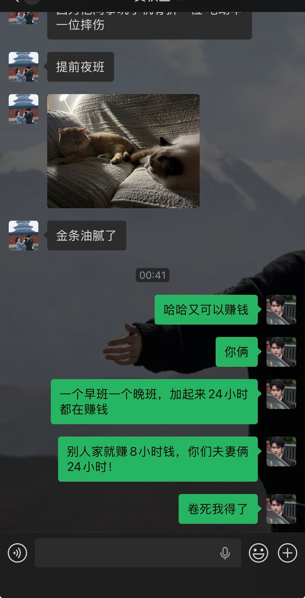 我那芯片封装厂的朋友,准备五一结婚。现在他们家24小时都在赚钱。情况是这样:她老公夜班,她本人白班。要求基础工作时间+强制加班,合计一个人一天12小时的工作时间。结婚之后他俩一个早班一个班。别人家一天赚钱8小时。他们家24都在赚钱。他们人均收入1.3税前,实际到手不到1w。问了一下确实合计家庭月收入2.5w下周他们准备全款提su7pro