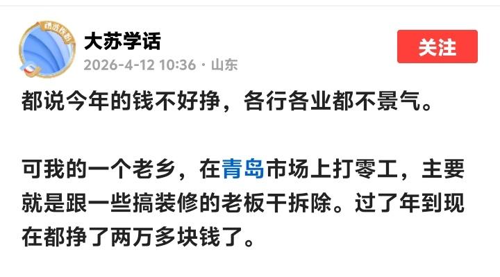 当无数人还在春节的余温里感叹“钱难赚、工作难找”时,一位青岛打零工的老乡,用他沾满灰尘的双手,默默撕开了这层抱怨的遮羞布。正月初六,年味未散,他已返回青岛的装修工地,抡起大锤干起了拆除。短短三个月,两万多元实实在在揣进口袋。这不仅仅是一个赚钱的故事,更是一面照见浮躁人心的镜子。