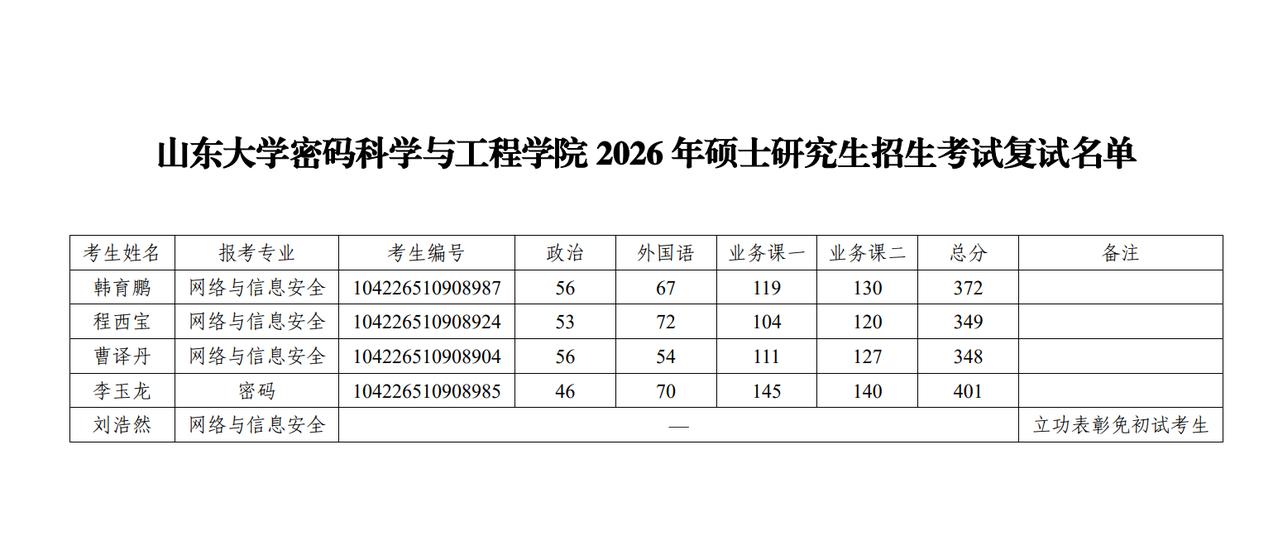 进入调剂环节,密码专业突然增加到4个计划,有点令人意外。更令人意外的是,报名调剂的学生多达数人,最终393分以上的20名考生进入了复试名单。名单中400分以上的多达11人,高手云集,且这20名考生一志愿全部是985院校,1名清华、1名复旦、4名中科大,西交,川大、电子科大、西工大各1名,7名山大、3名中南。