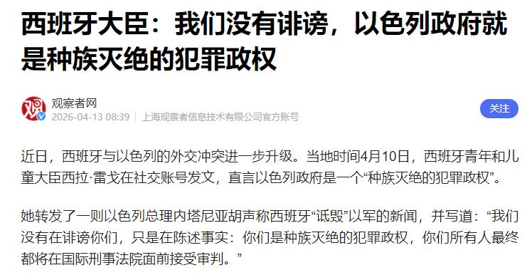当地时间4月10号,西班牙青年和儿童大臣西拉·雷戈,直接在社交平台上怒怼以色列,明明白白说以色列政府就是“种族灭绝的犯罪政权”,还放话:我们没诽谤你们,说的全是实话,你们这些人,迟早要到国际刑事法院受审。