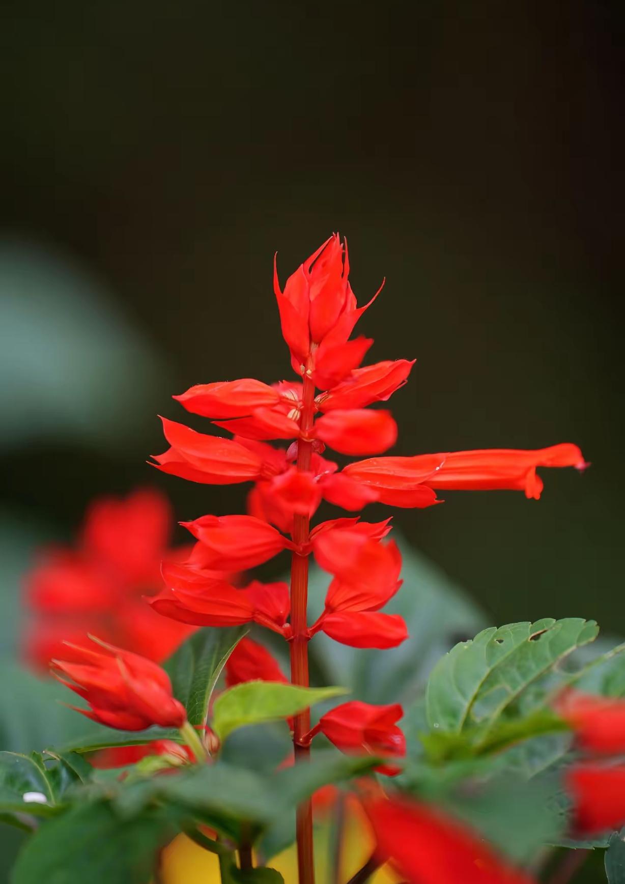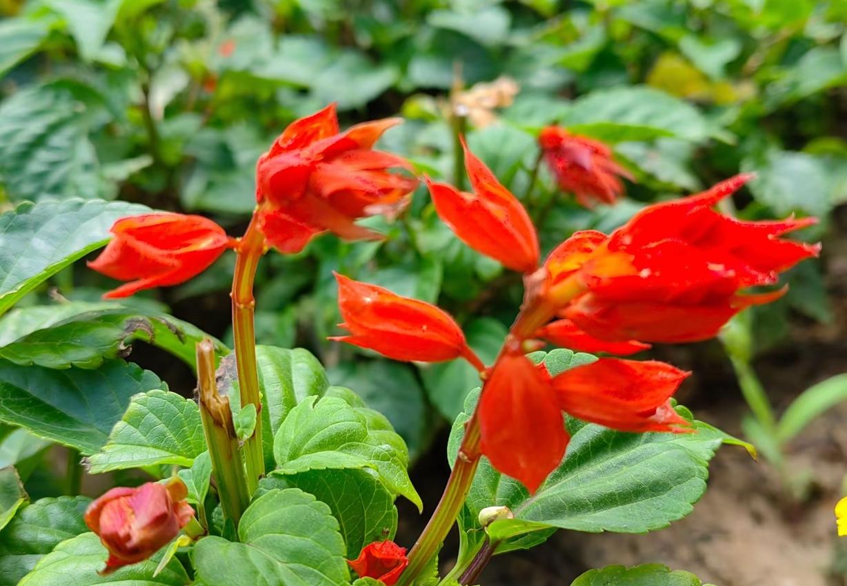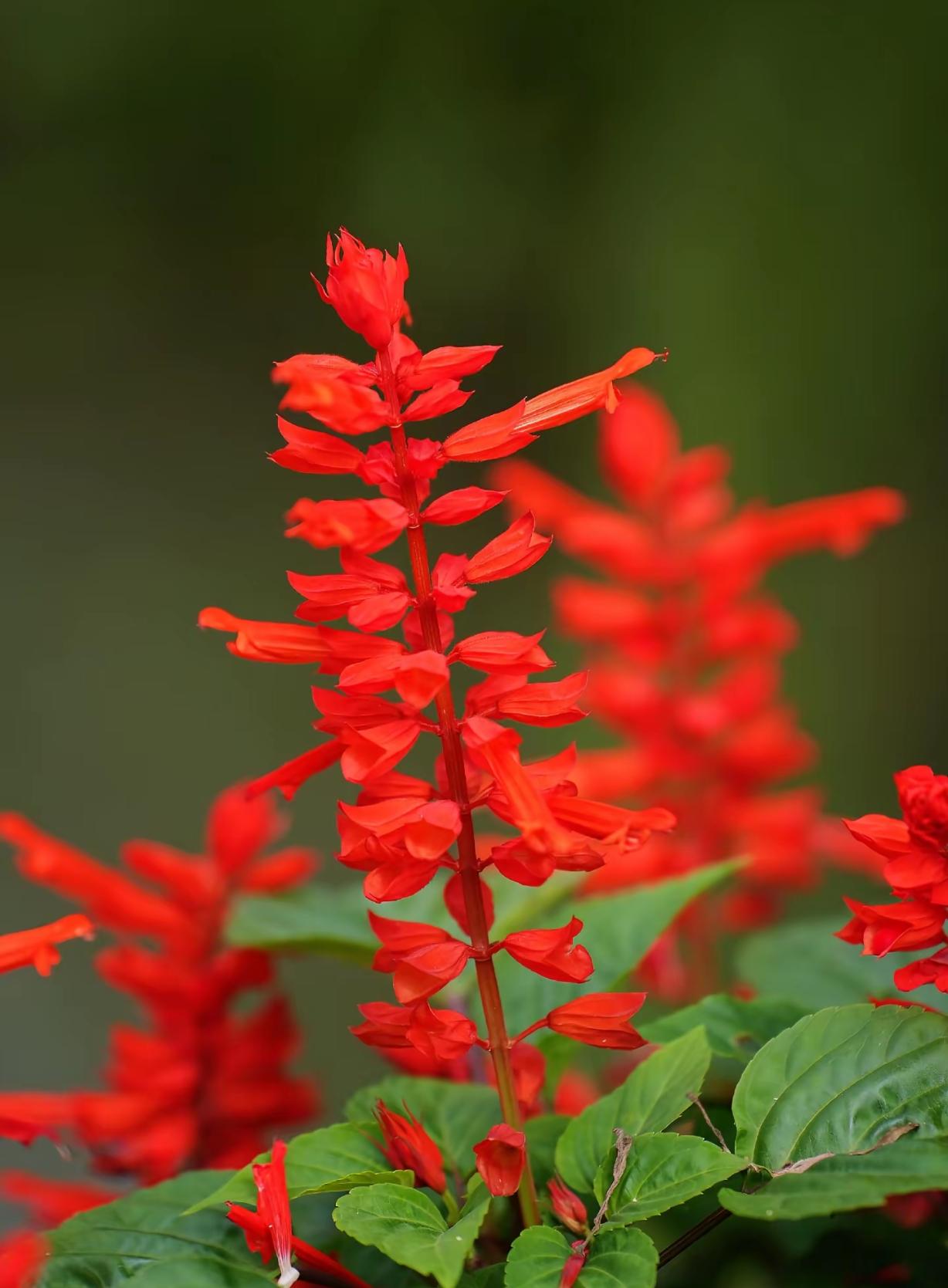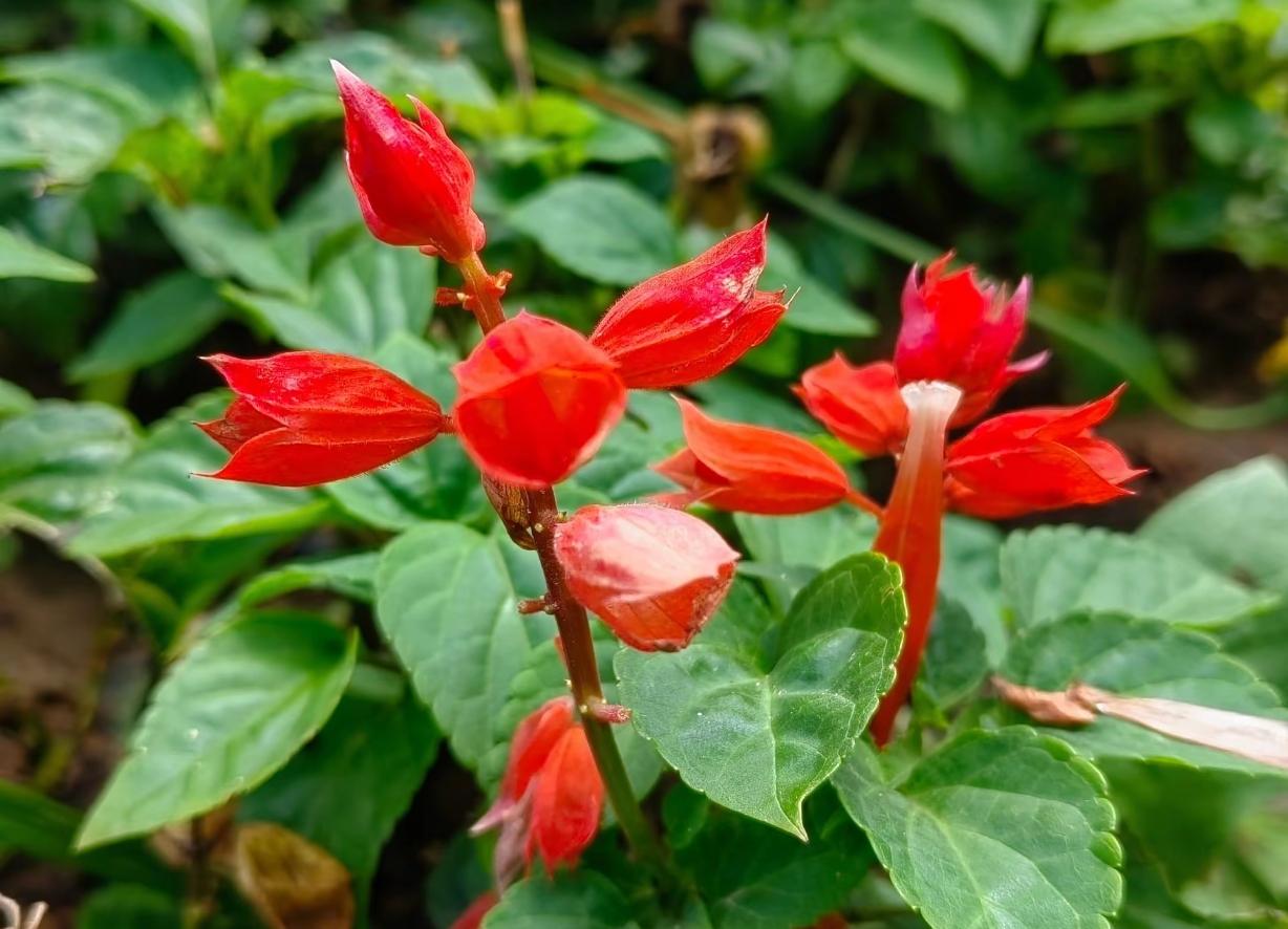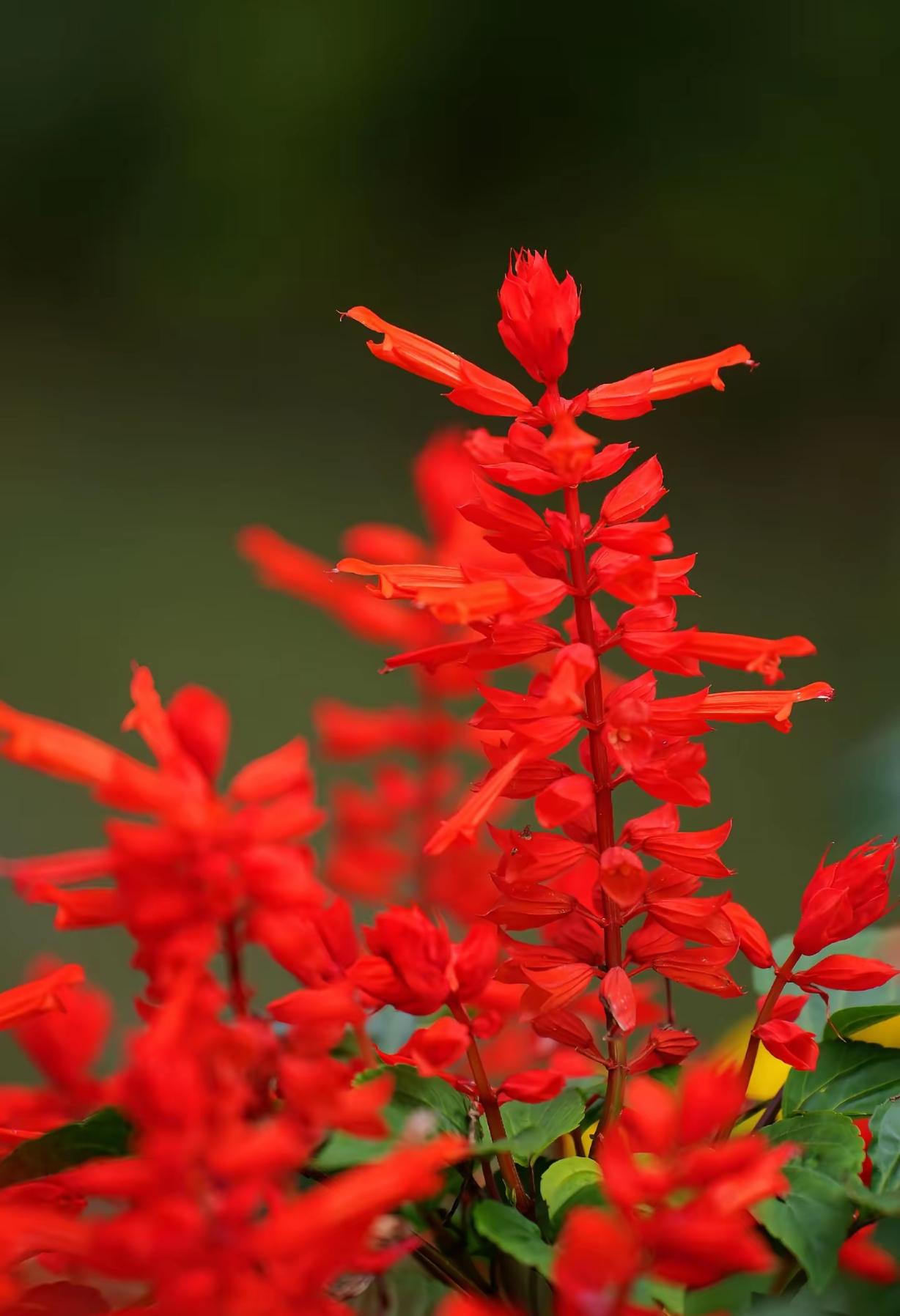 串红花在花坛、庭院里很常见,一到花期,那红彤彤的花串格外引人注目。它的花朵呈筒状,紧密排列在花茎上,远看就像一串串燃烧的火焰。每次看到串红花,都感觉像是看到了一把把热情的火炬,瞬间让周围都变得热闹起来。