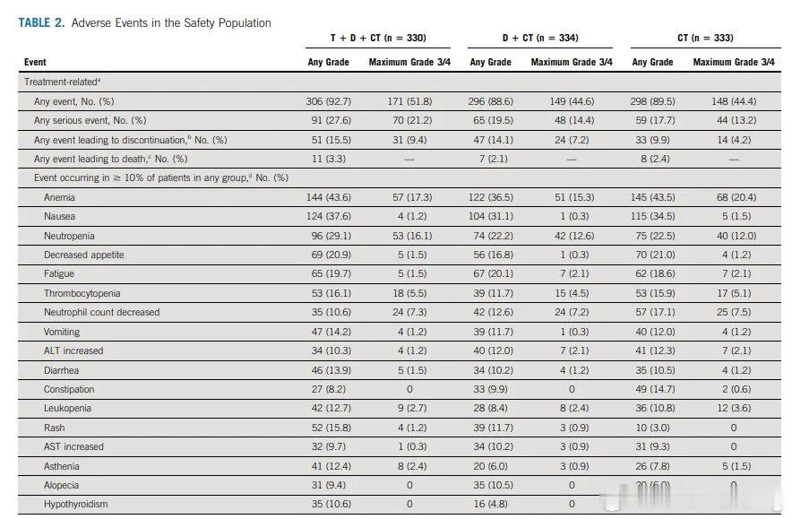 在安全性方面,研究者判定的任何级别治疗相关不良事件(TRAE)在曲麦利尤单抗 + 度伐利尤单抗 + 化疗(T+D+CT)组、度伐利尤单抗 + 化疗(D+CT)组和单纯化疗(CT)组中的发生率分别为 92.7%(306/330 例)、88.6%(296/334 例)和 89.5%(298/333 例)(见下表)。