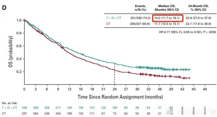 中位 OS 达14.0 个月,2 年 OS 率33%,显著优于化疗组(11.7 个月、22%);