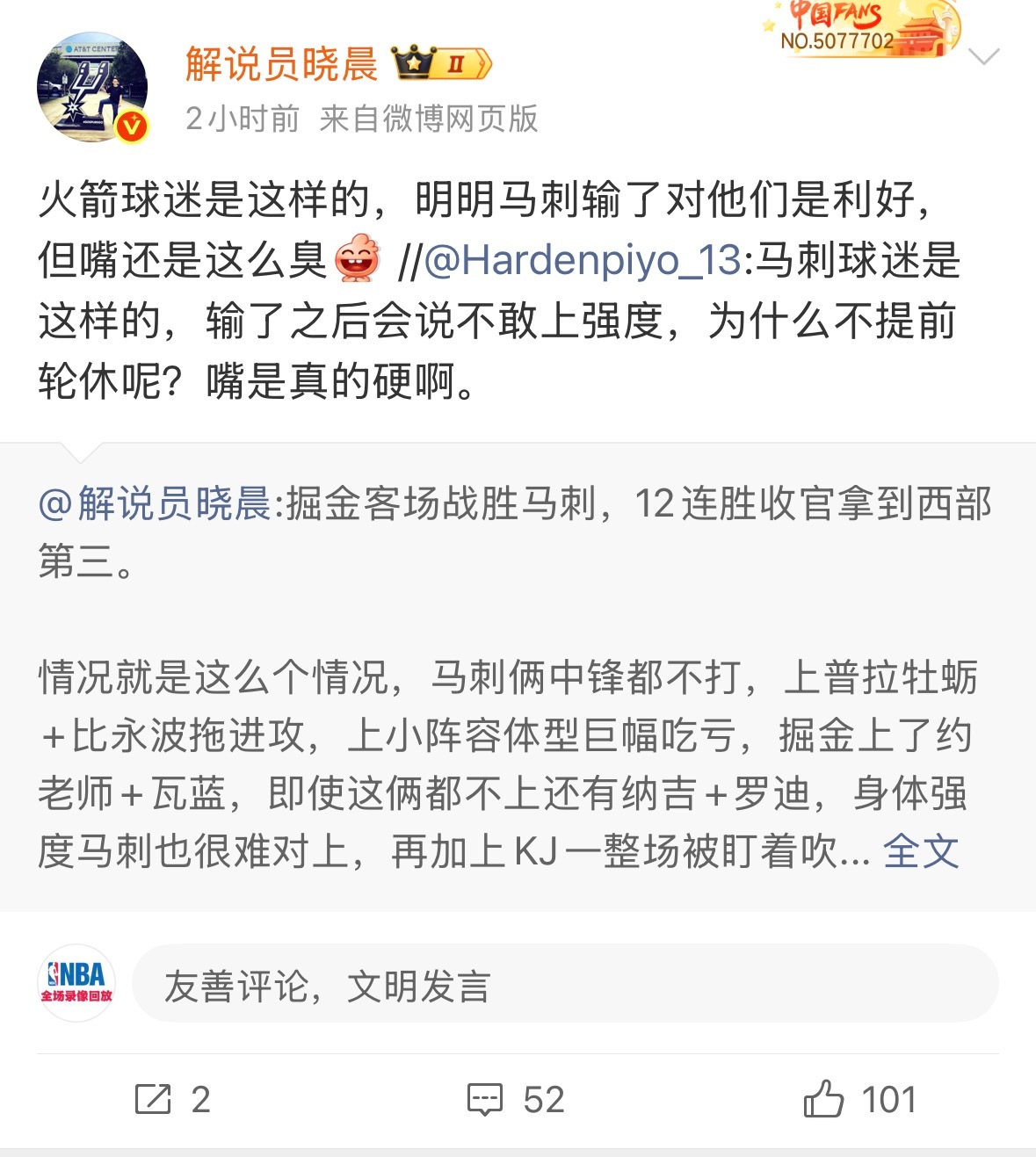 马刺都恨不得把文班派上去了,还说不想赢?也是逆天了……我不说看过全场比赛,就是只看过最后几分钟的都知道马刺有多想赢啊,搁这装啥呢?嘴硬还不让说?马刺输了对火箭就是利好没错啊,但是也不妨碍大家说实话吧?你说的嘴臭和利好火箭有一点逻辑关系吗?(不会真有人觉得马刺输了,火箭就要对马刺感恩戴德吧😂,说得好像你们故意输的一样……)你可以嘴硬别人不能“嘴臭”?