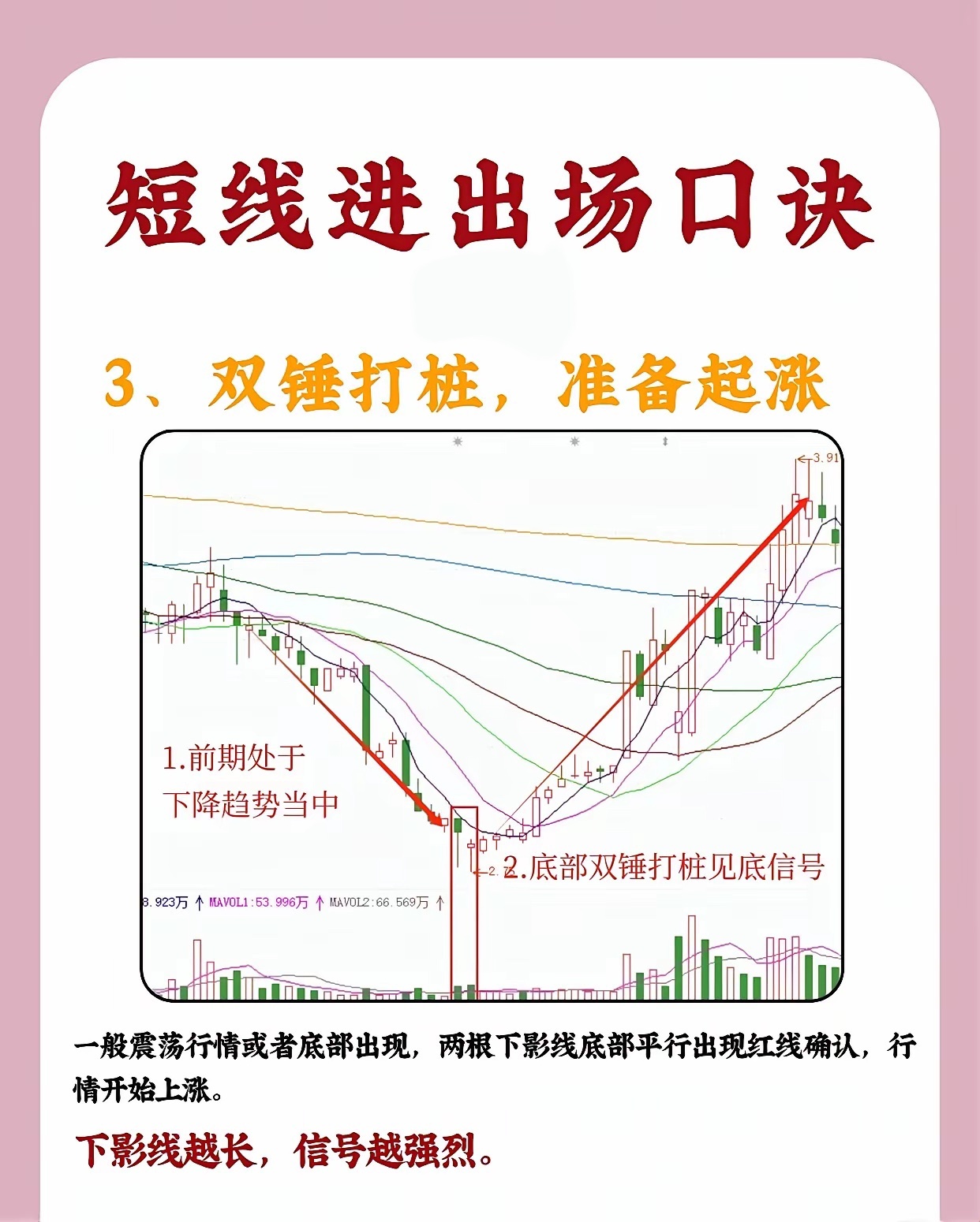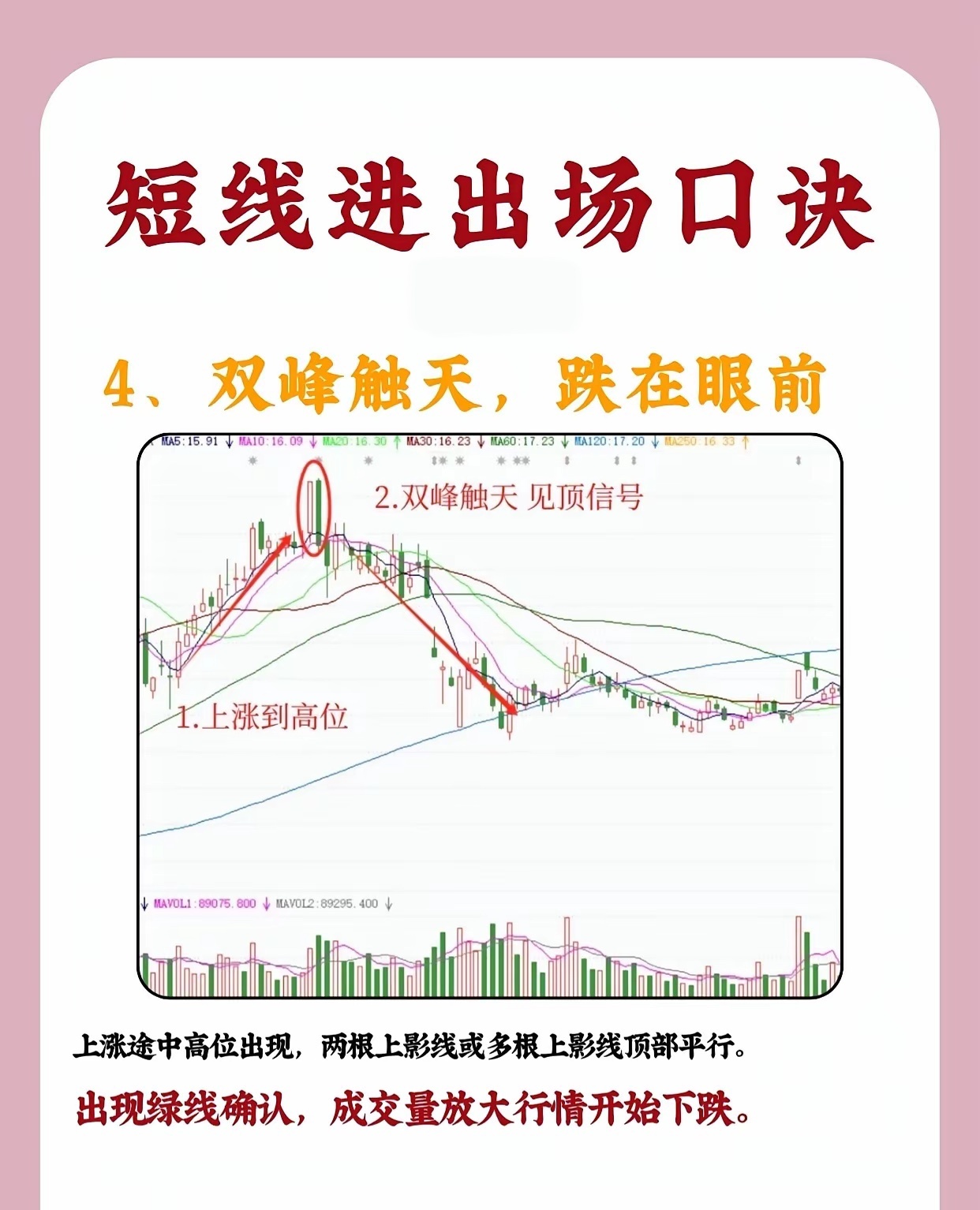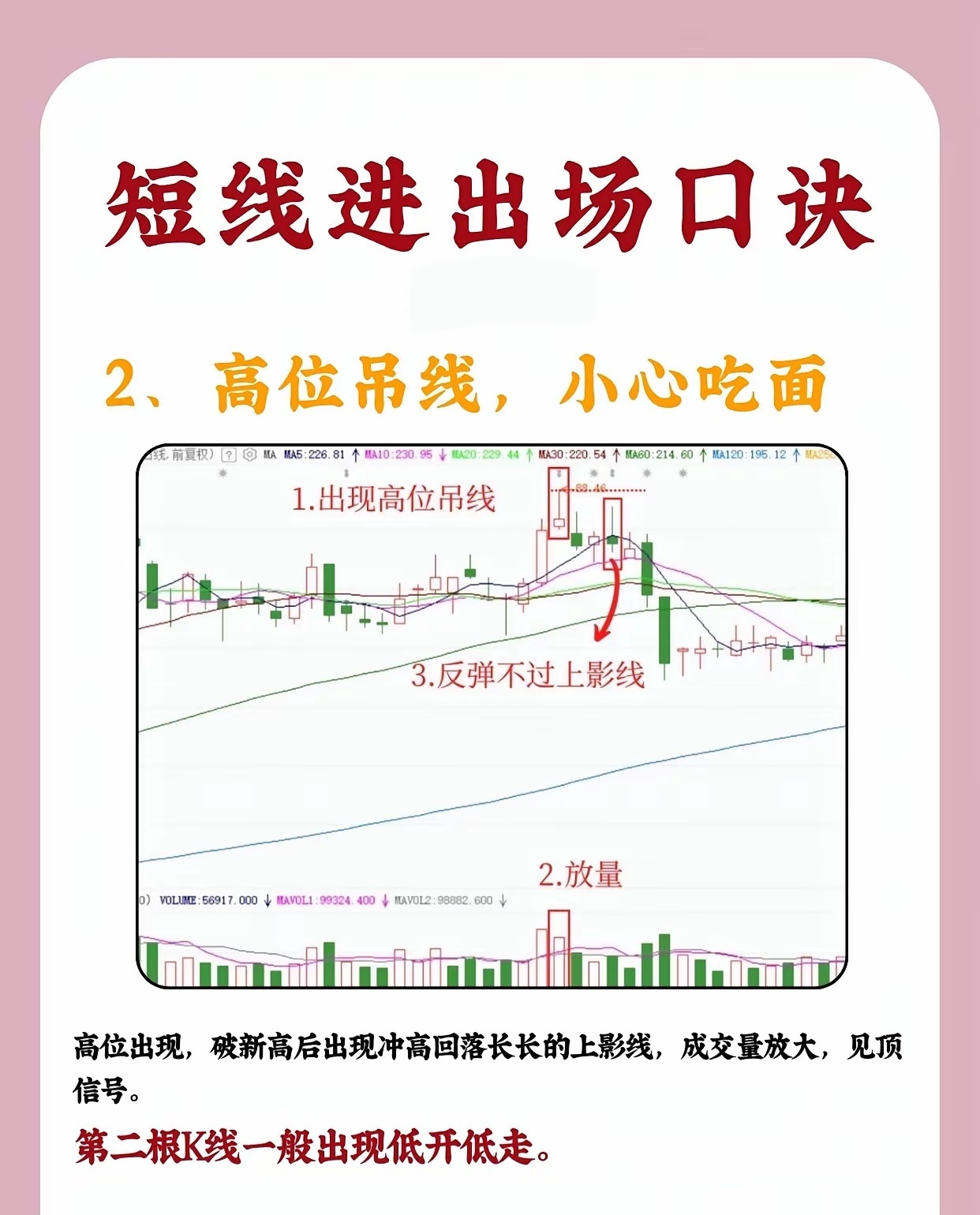 短线进出场口诀1、仙人指路,大胆进入股价处于上升趋势中时,若出现带长上影线的小阳线或小阴线(即“仙人指路”K线),且当日收盘价较前一日上涨、成交量明显放大,说明多头尝试向上突破后虽有回落,但承接力较强。该形态出现后,1 - 2个交易日内可择机入场,后续往往延续升势。2、高位吊线,小心吃面当股价在高位冲高回落,收出上影线极长、实体极小的K线(类似“吊颈线”),且成交量显著放大,同时后续反弹时无法突破该长上影线的顶端,这通常是见顶信号。次日K线往往低开低走,需及时止盈或止损,防范下跌风险(“吃面”即亏损)。3、双锤打桩,准备起涨若股价前期处于下降趋势或震荡行情中,底部区域出现两根下影线平行、底部价位相近的K线(即“双锤打桩”),且随后出现阳线确认,说明下方支撑强劲,多头开始发力。下影线越长,底部信号越强烈,后续行情大概率启动上涨。4、双峰触天,跌在眼前股价上涨至高位时,若出现两根(或多根)上影线平行、顶部价位相近的K线(即“双峰触天”),且出现阴线确认、成交量放大,意味着上方抛压沉重,多头无力突破,行情将转为下跌,需果断离场规避风险。(注:技术形态需结合大盘环境、个股基本面综合判断,请勿单一依赖口诀操作。)