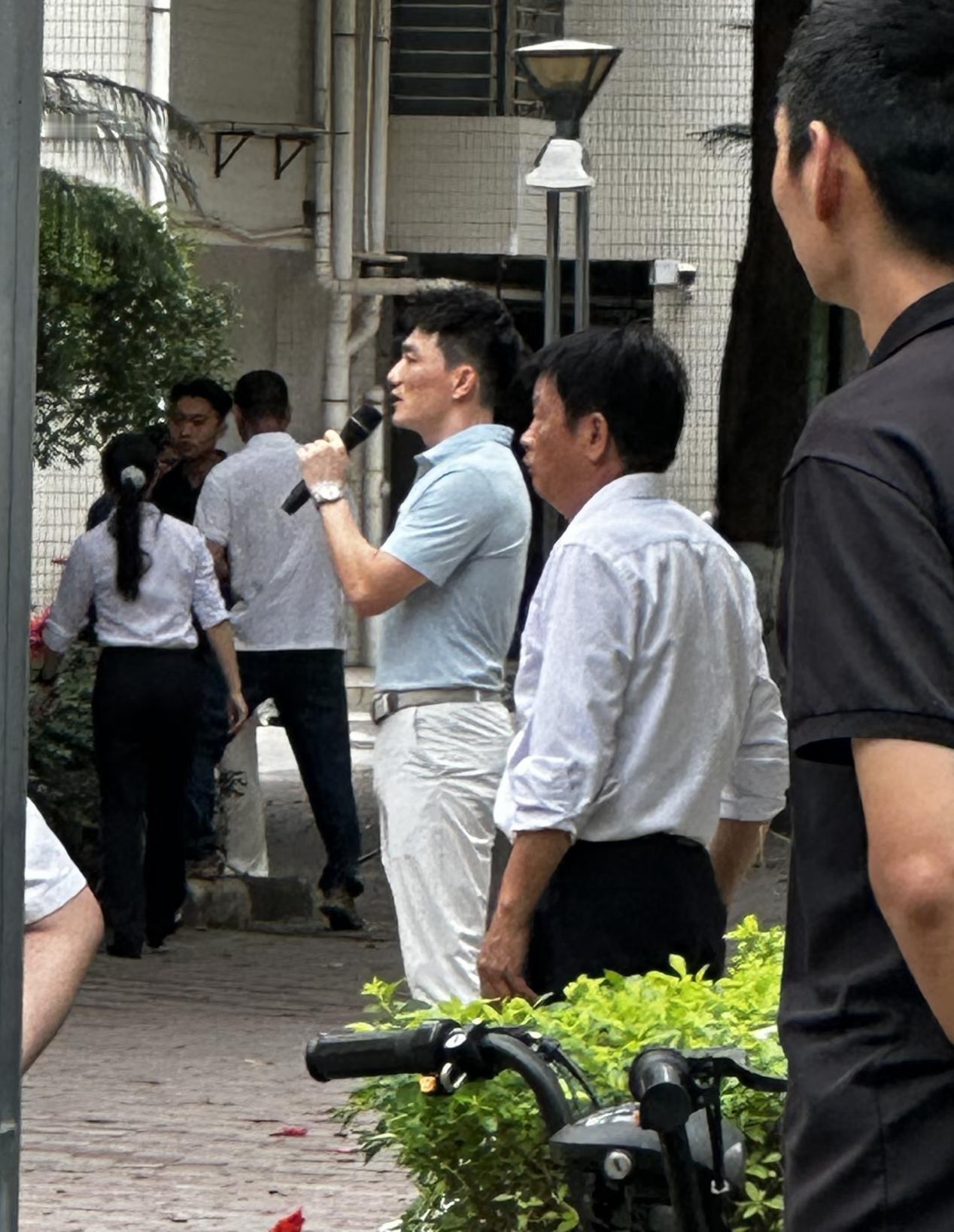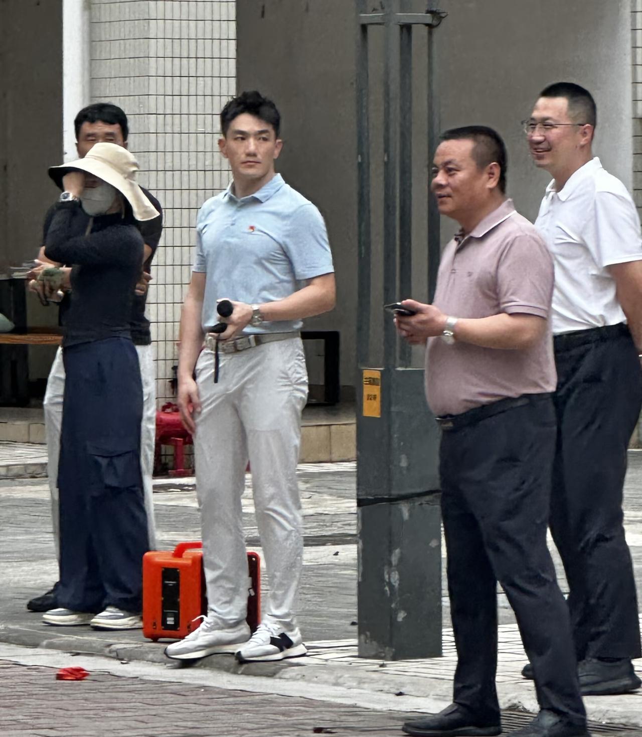 4月14日,张馨予老公何捷在广州大学校区内被偶遇,他正在给保安们上消防演练课,一