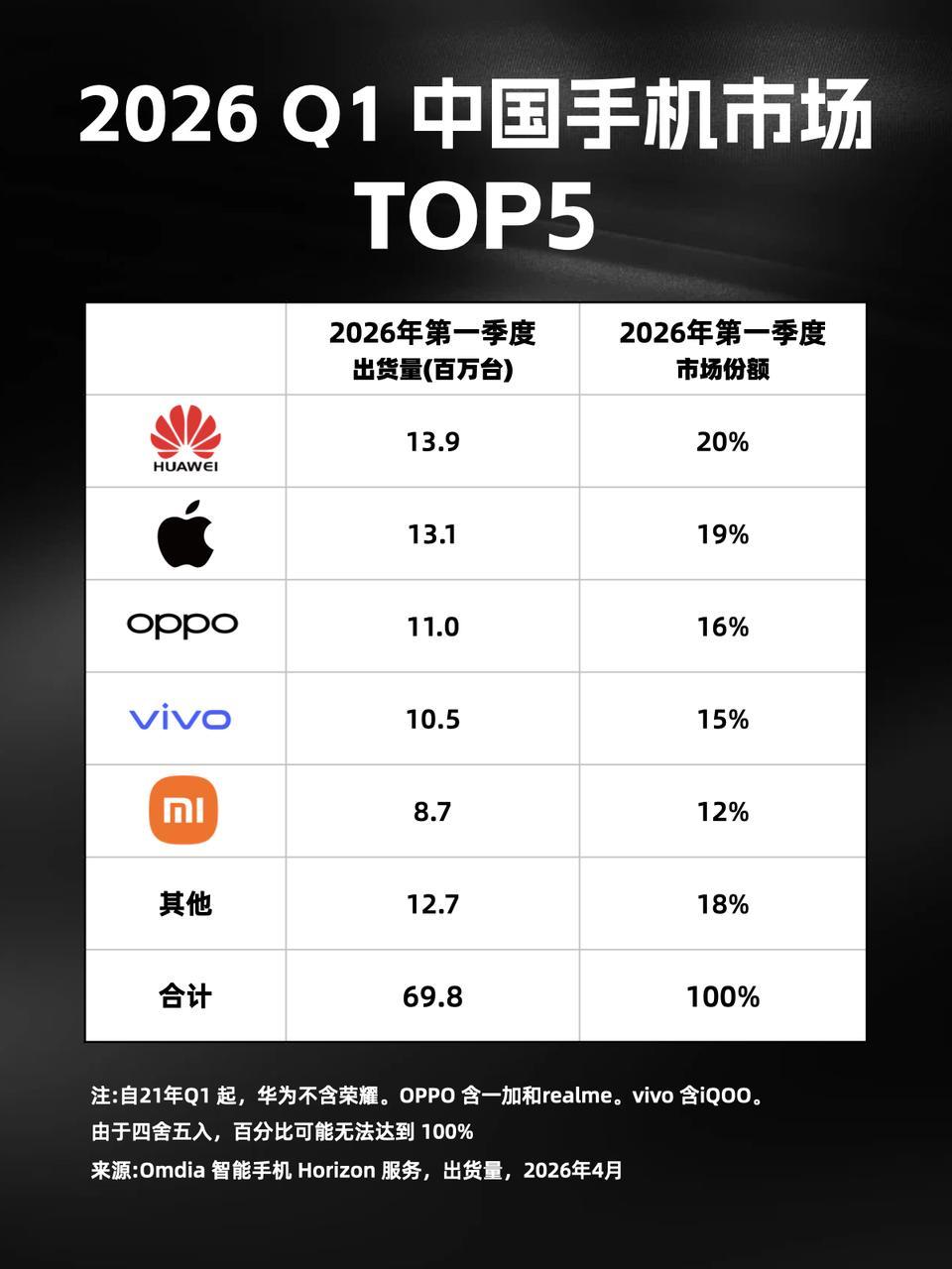 另外,刚看到Q1季度手机出货量数据,华为第☝🏻,苹果第✌🏻,OPPO稳居前三,出货超千万台。