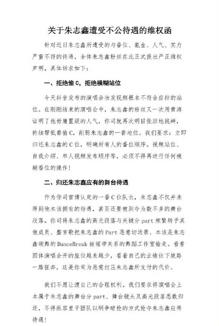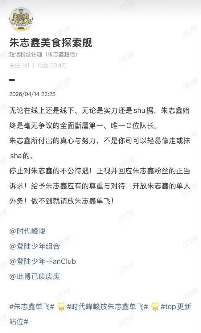 朱志鑫家向时代峰峻提出诉求,要求归还C位待遇,开放个人外务。