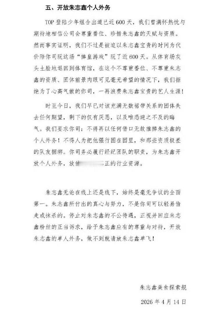 朱志鑫家向时代峰峻提出诉求,要求归还C位待遇,开放个人外务。 他是top团c位出
