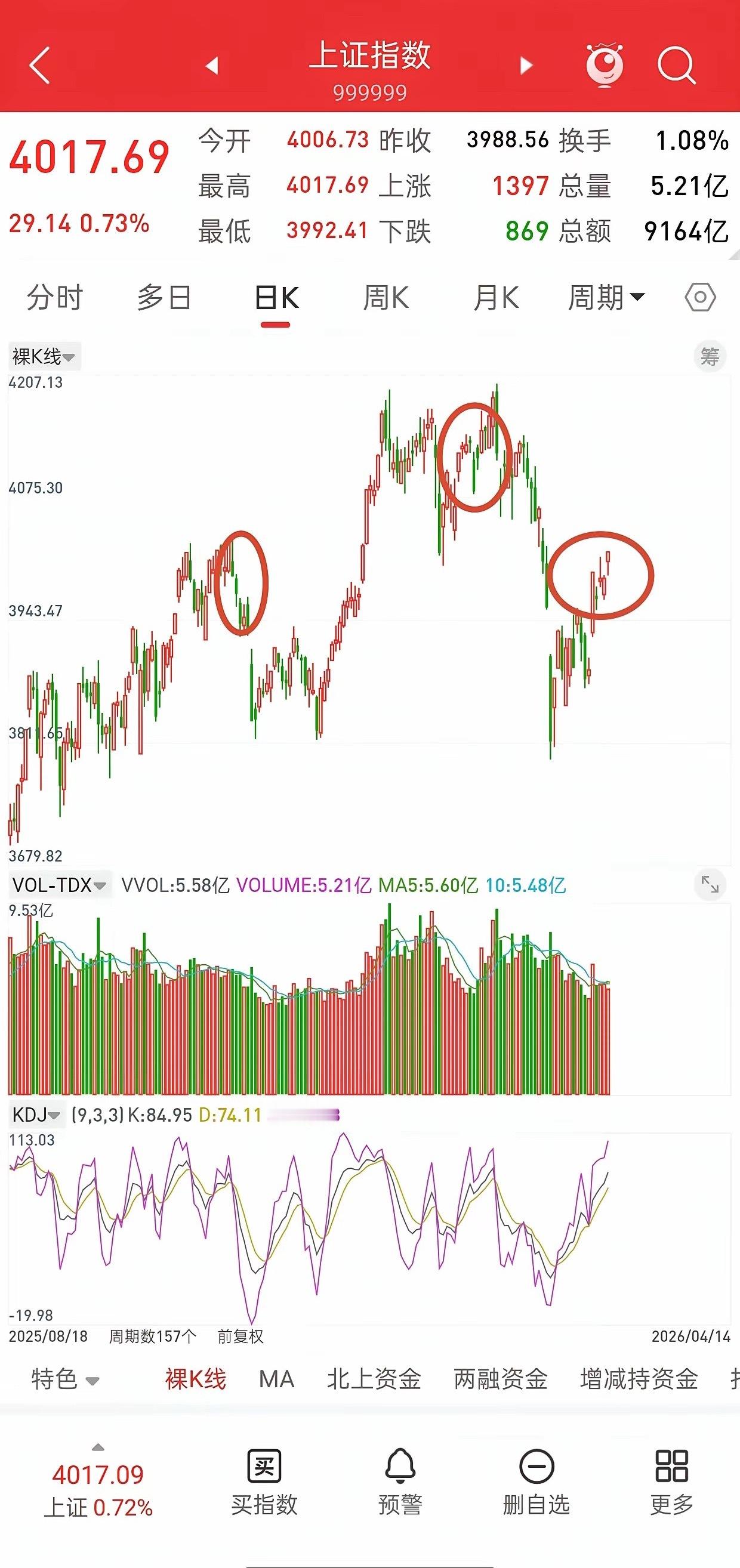 A股,4000点上方,任何反弹都是主力诱多的手段!下午回落一下,又创了新高,符合预期,再往上拉依然符合预期,但是风险也是随时会释放。还是那句话,主力的耐心不是我们散户能轻易做到的,越往上拉,就越会有人抵不住诱惑,还有就是,谁会帮4025前顶以上的套牢盘筹码解套,就是当前买入的筹码。从4.8号最高点3995,到现在最高点4023,30点左右空间,行情运行四天。让子弹飞一会,很快就会水落石出。