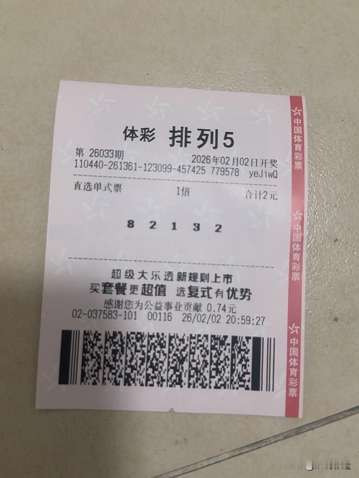 2026年2月2日排列五开奖,号码是14132。我买的82132,只逮住了后三位,前两位没抓住,可惜了!彩票这东西,开奖结果全凭随机概率。好多彩民像我一样,喜欢结合历史数据做走势参考,就像2月1日排列三开奖号码7、3、0,从基础数据看,奇偶比2:1,大小比1:2,和值10,跨度7。近期排列三热号集中在2、8、9等。不过就算分析得头头是道,也不能保证100%中奖。