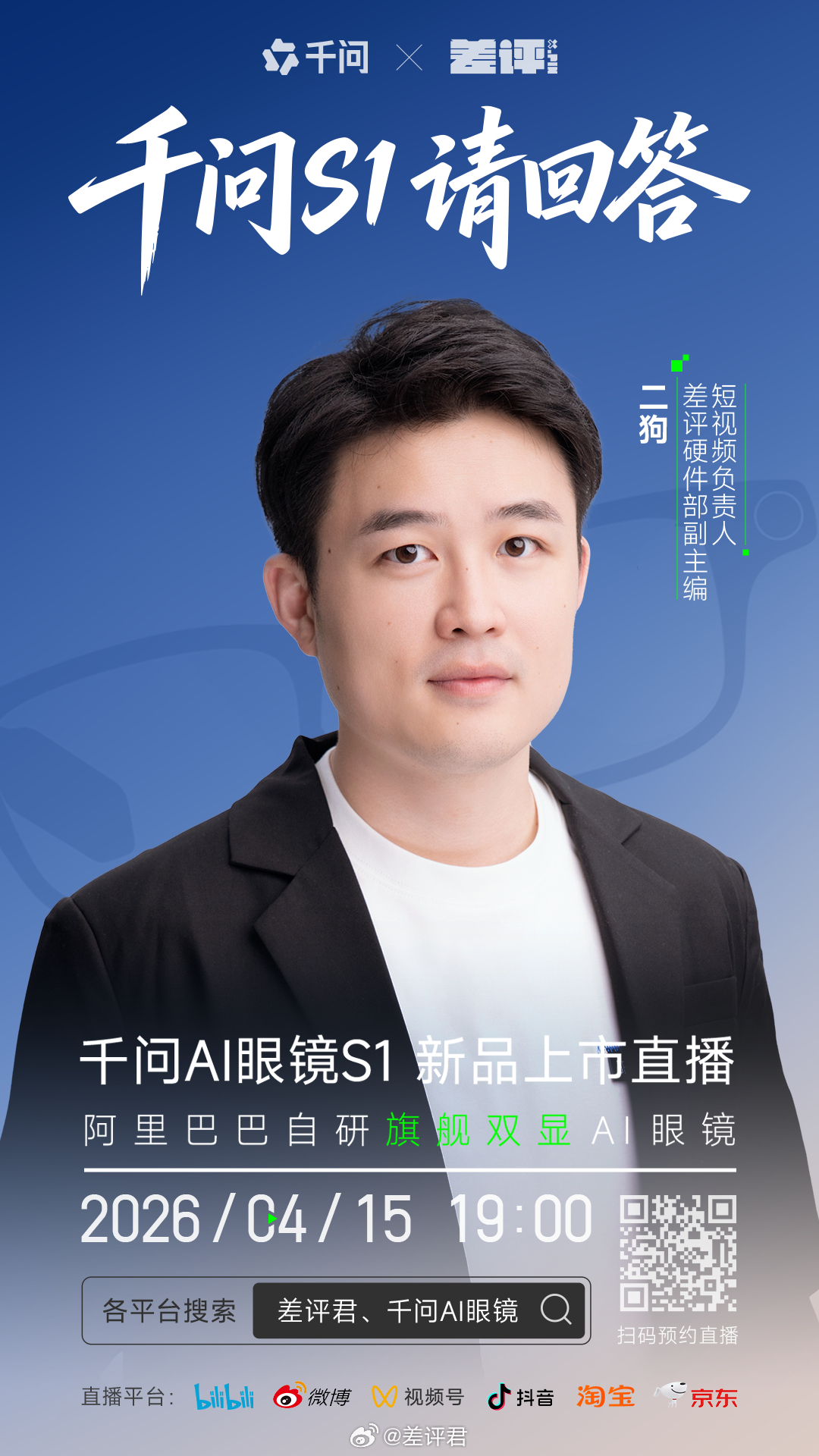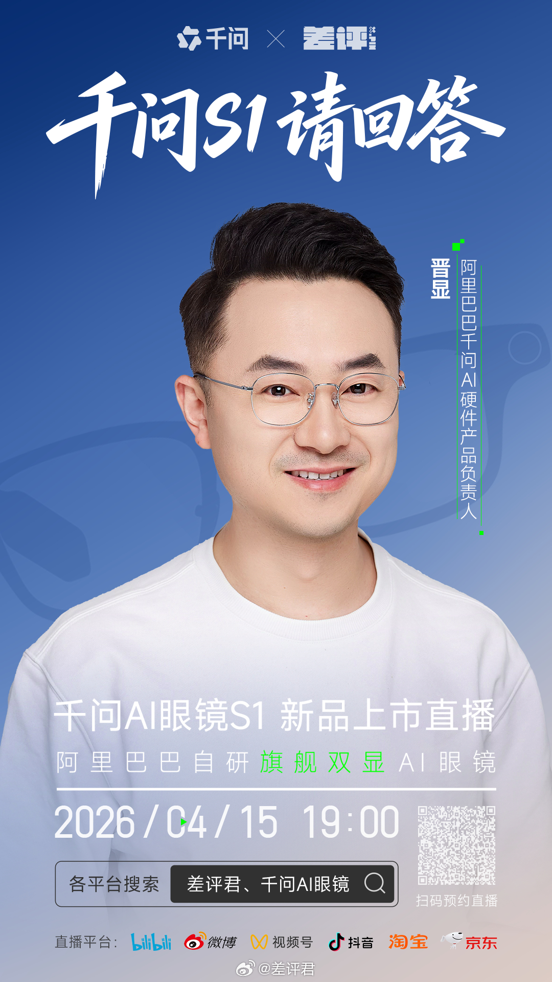 差友们应该都预约了今晚我们和千问S1的直播吧?离开播还剩几小时了,我来预告一波嘉宾。晚上是大家熟悉的二狗主持,我们请来了「阿里巴巴千问AI硬件产品负责人-晋显」,以及大家同样很熟悉的老朋友 。欢迎锁定今晚19:00的直播!我们一起聊透千问AI眼镜S1~