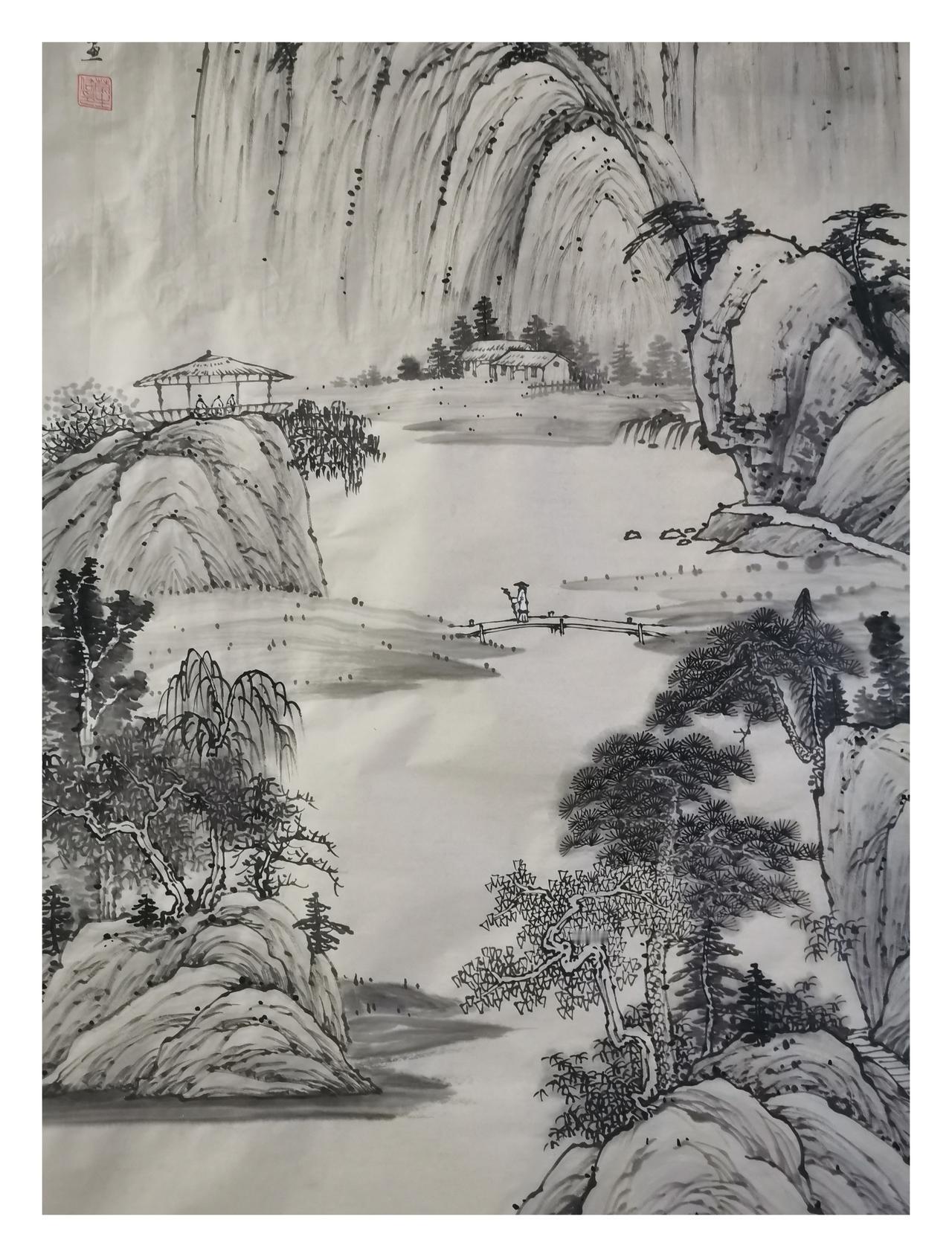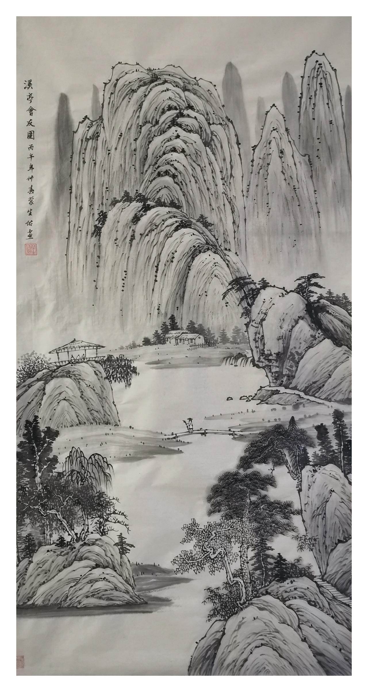 中国山水画原创作品欣赏:传统山水山水画 尺寸:四尺(138x68) 《溪亭会友图