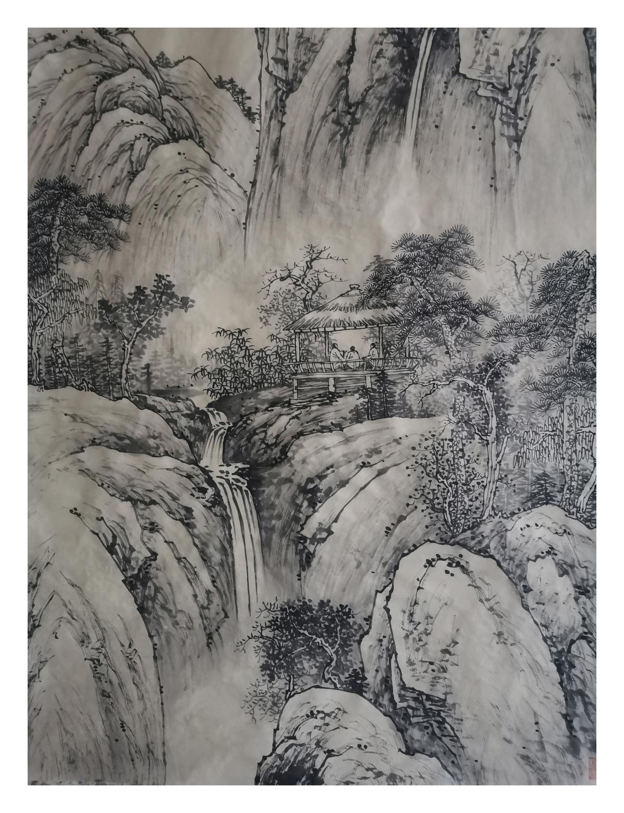 题曰:《松溪听泉图》水墨中国山水画 宁静的山水画 山水画瀑布
