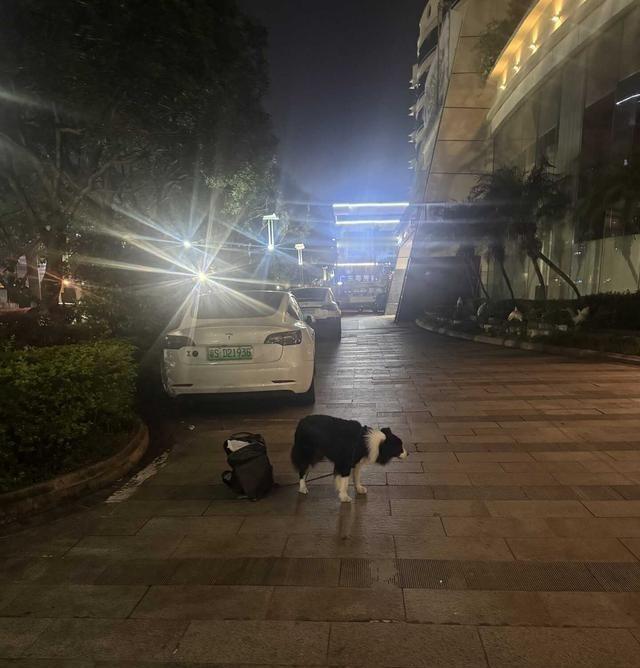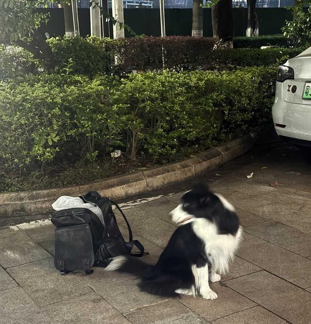 番禺广场酒店门口,一只边牧被拴在背包上,疑似被遗弃。狗子特别乖,一直在摇尾巴,看