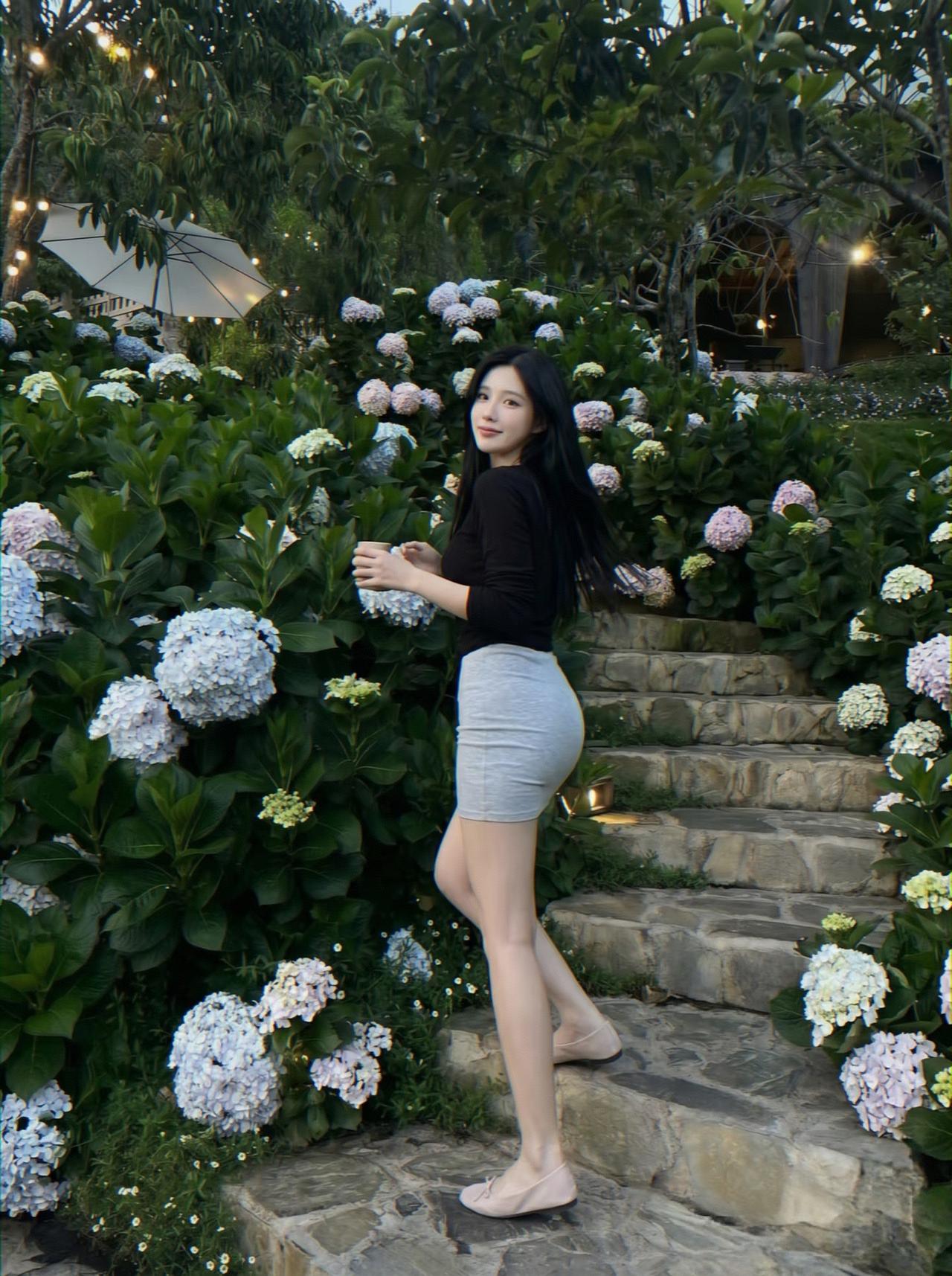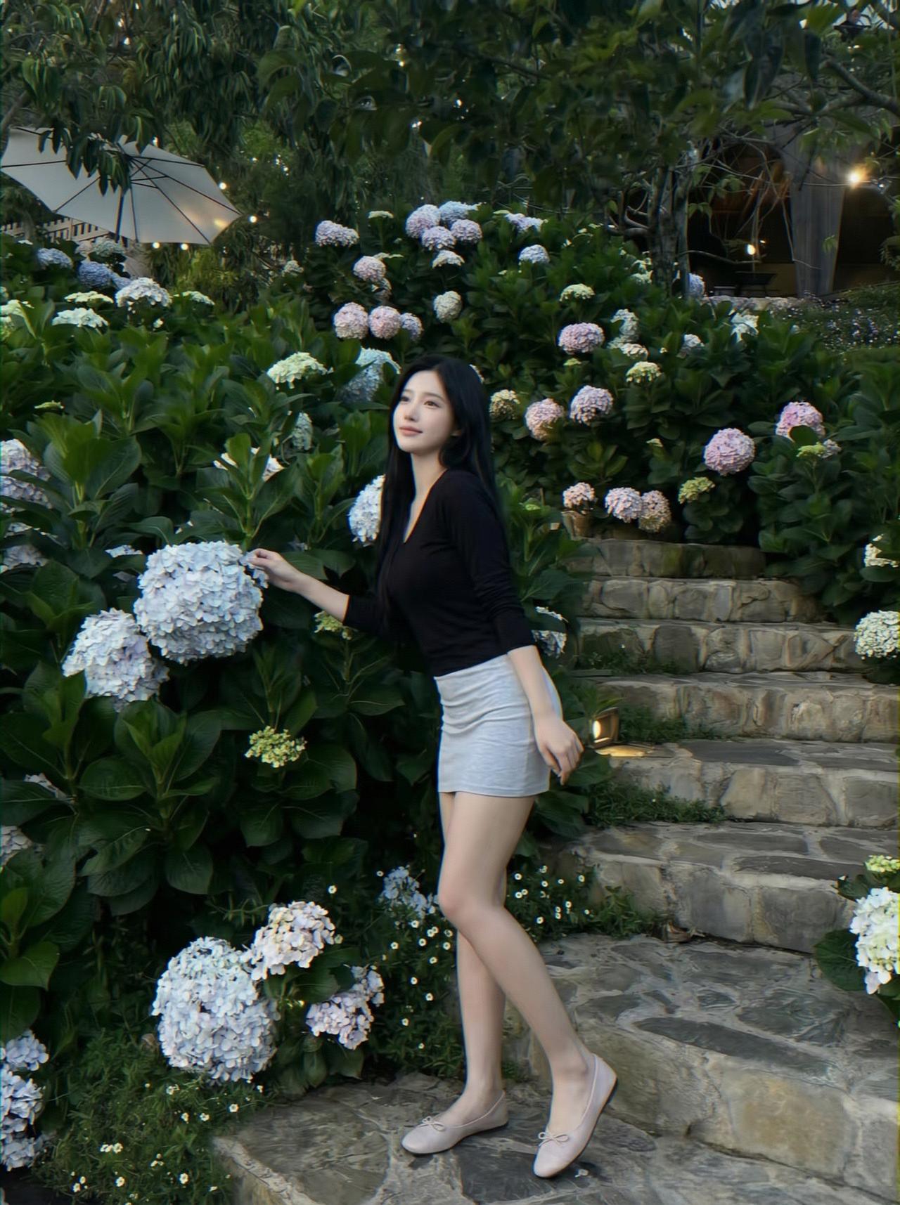 闲庭晴日暖,素影立娉婷。衫浅凝霜雪,裙灰衬玉灵。眉如远山黛,眸似秋水明。一