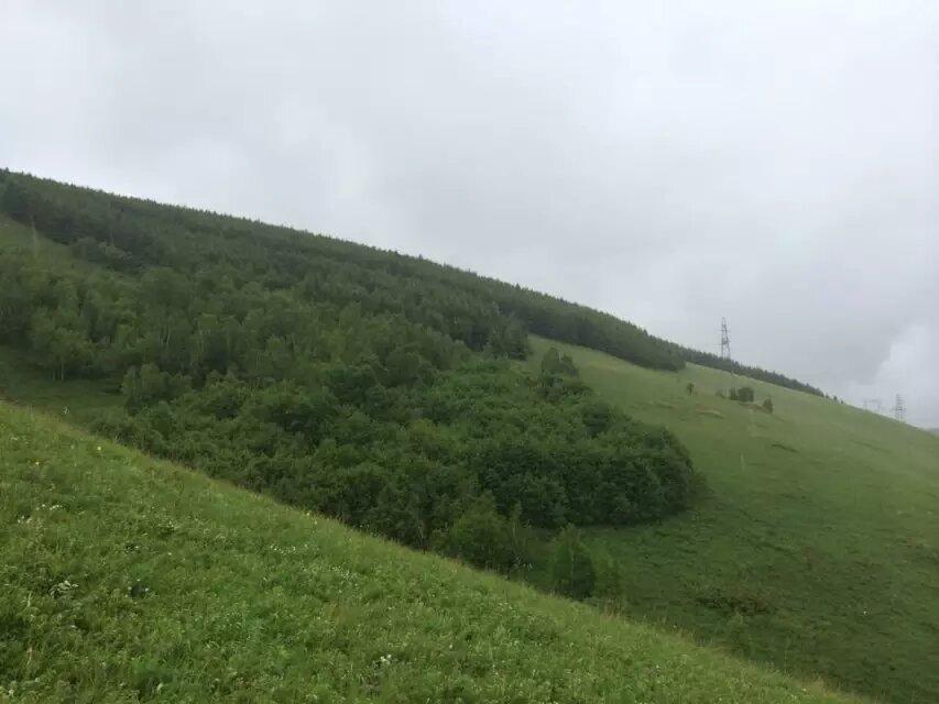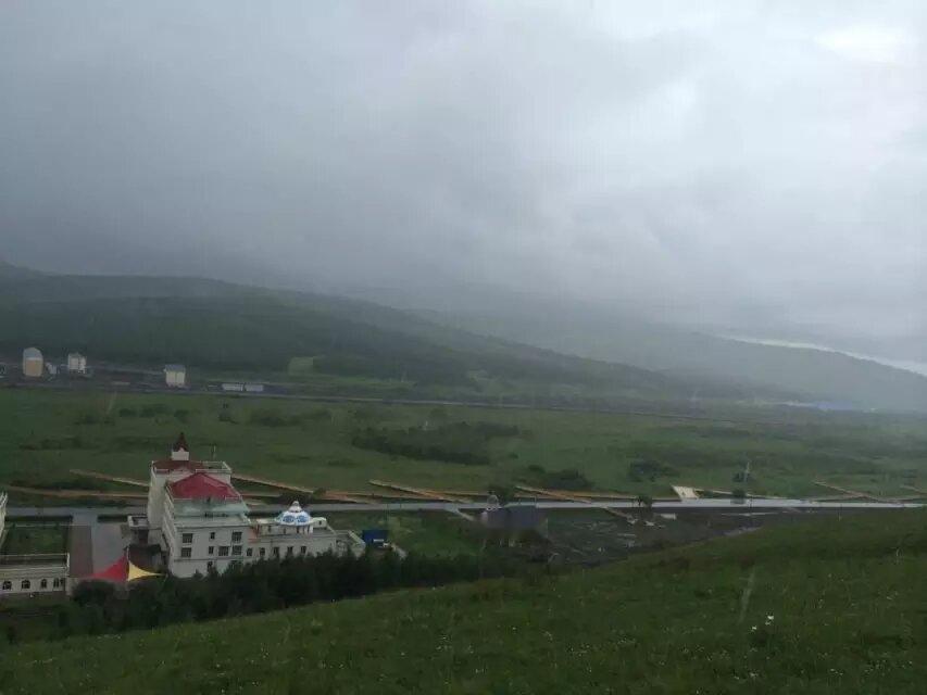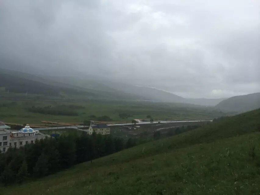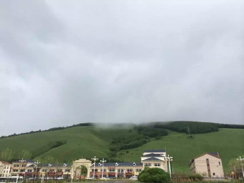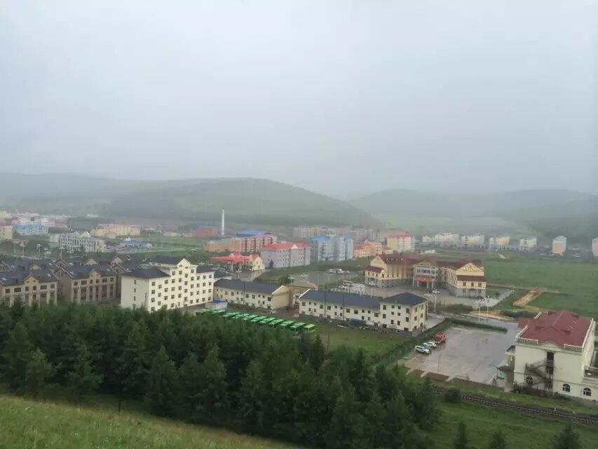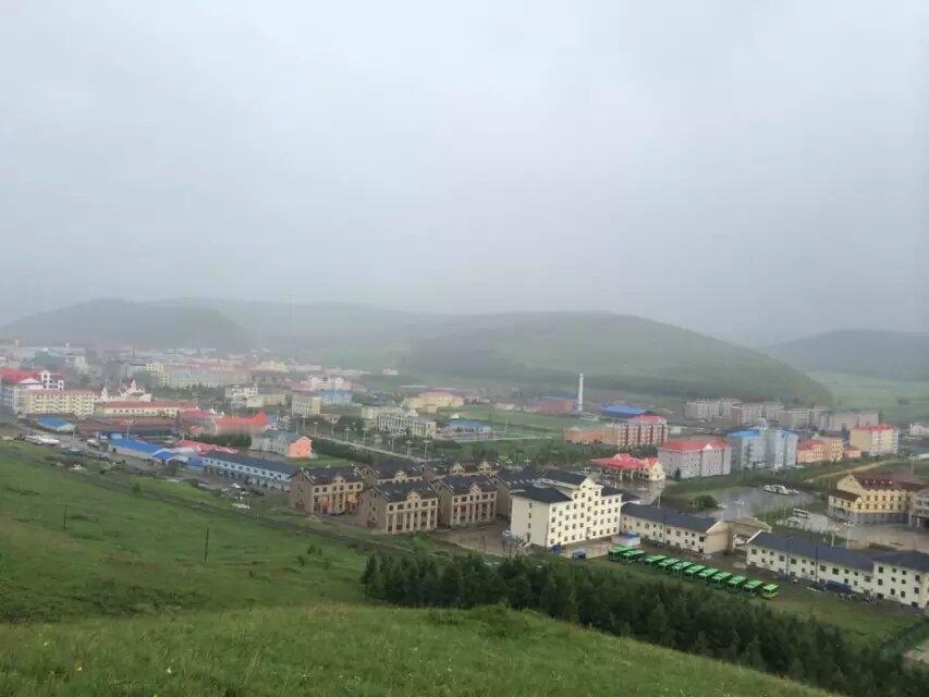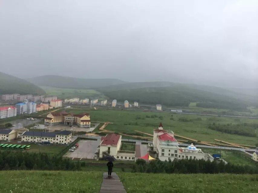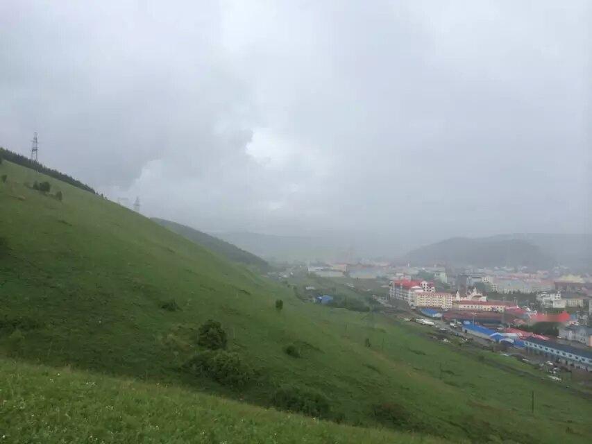 阿尔山市的气候和内地气候不一样的,那天穿了长袖都觉得冷一点,吃过晚饭后没有事,几个人一起去对面的山上,下着雨,有俩人半路就下去了,我和查哥一起走到了终点,往下看一个阿尔山市,哪里山上的植被不一样,一层层的,不像咱们家的那种植被,冷,植被不一样的。