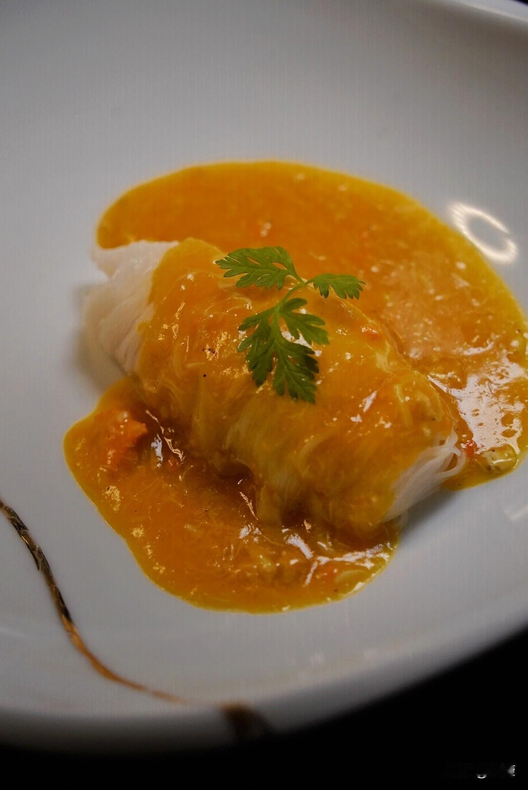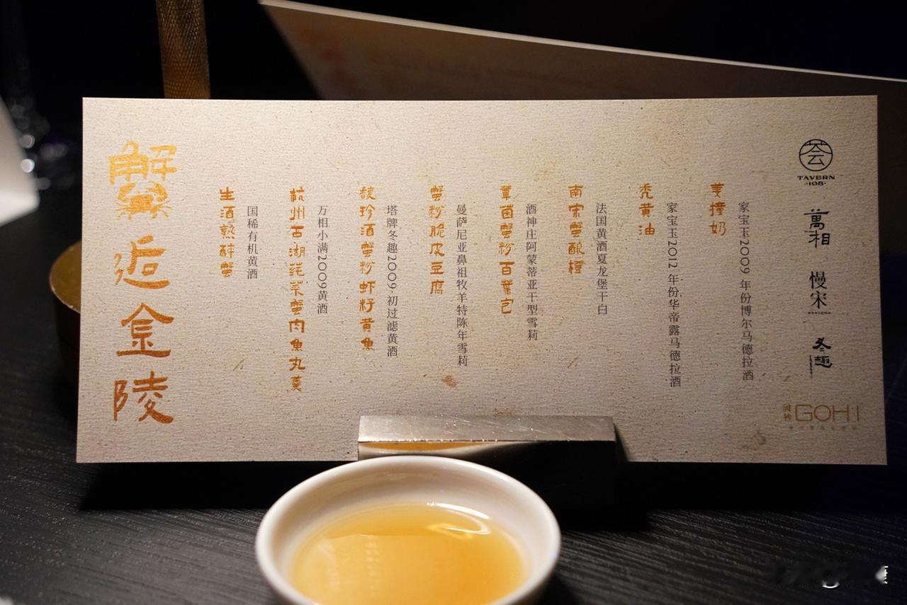 生酒熟醉蟹(国稀有机黄酒)、杭州西湖莼菜蟹肉鱼丸羹(万象小满2009黄酒)、馥珍酒蟹粉虾籽黄鱼(塔牌冬趣)、蟹粉脆皮豆腐(曼萨尼亚鼻祖牧羊陈年雪莉酒)、覃菌蟹粉百叶包(酒神庄阿蒙蒂亚雪莉)、南宋蟹酿橙(法国黄酒夏龙堡干白)、秃黄油配苏式面(家宝玉马德拉酒)、甜品姜撞奶。