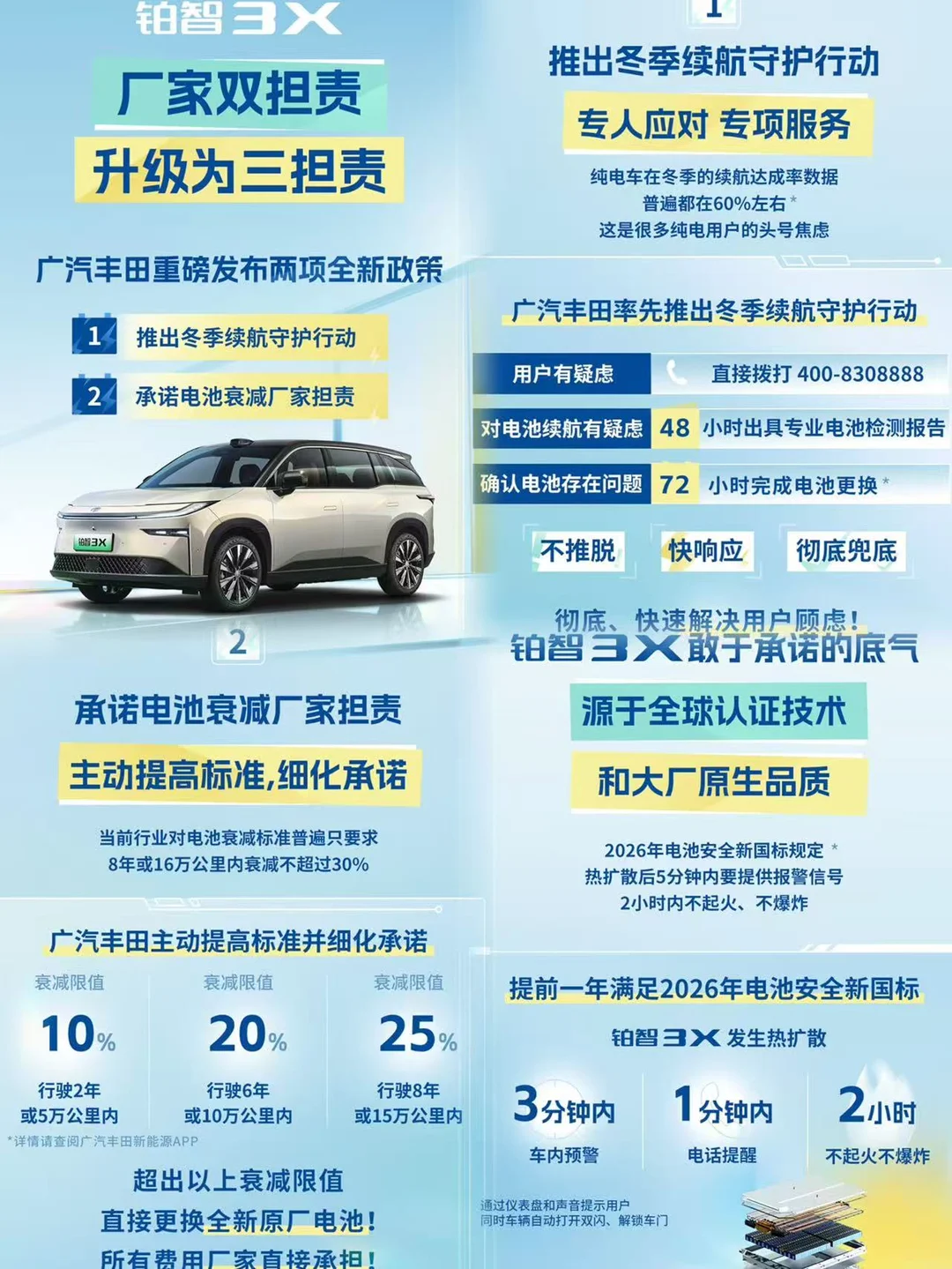 直到提了铂智3X,才算吃了定心丸。广汽丰田直接给了明确承诺:三电系统(电池、电机、电控)质量问题导致自燃,直接赔一台同配置全新车。不扣折旧、不用跟保险耗、不用到处举证,厂家主动把风险全揽过去,主动为用户兜底。