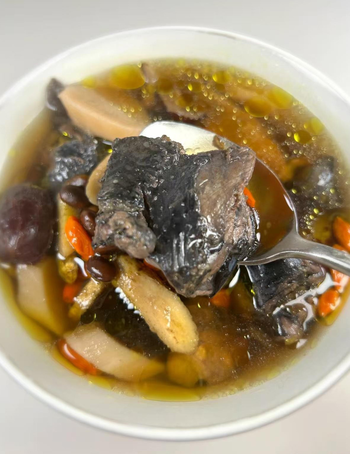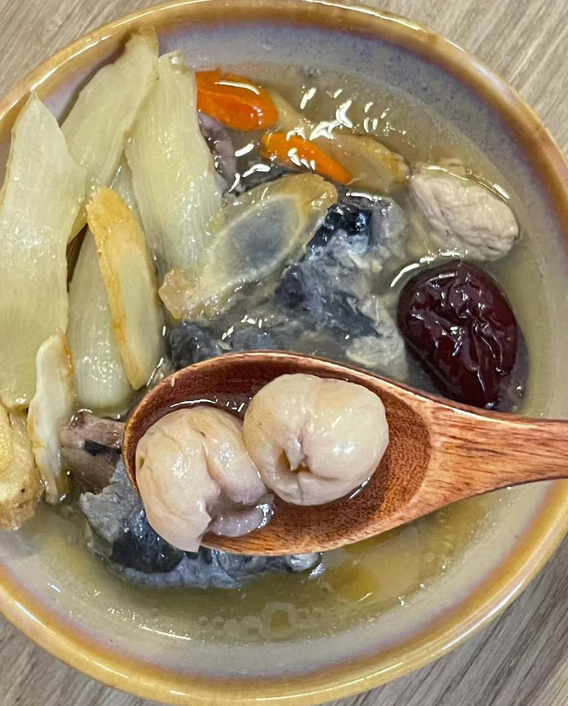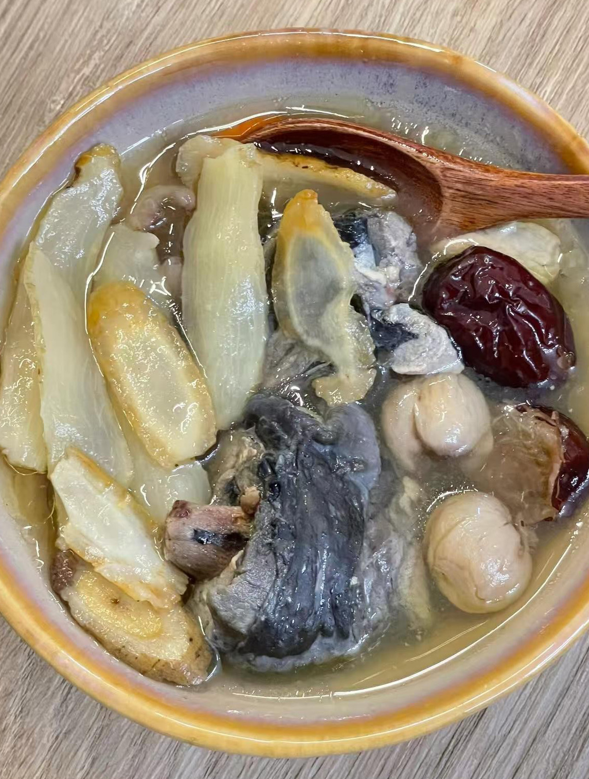 所有食材放入炖锅,炖 2 小时,最后放枸杞、加盐调味暖身滋补,养肾又养发,春天喝超舒服,长辈喝着超合适~