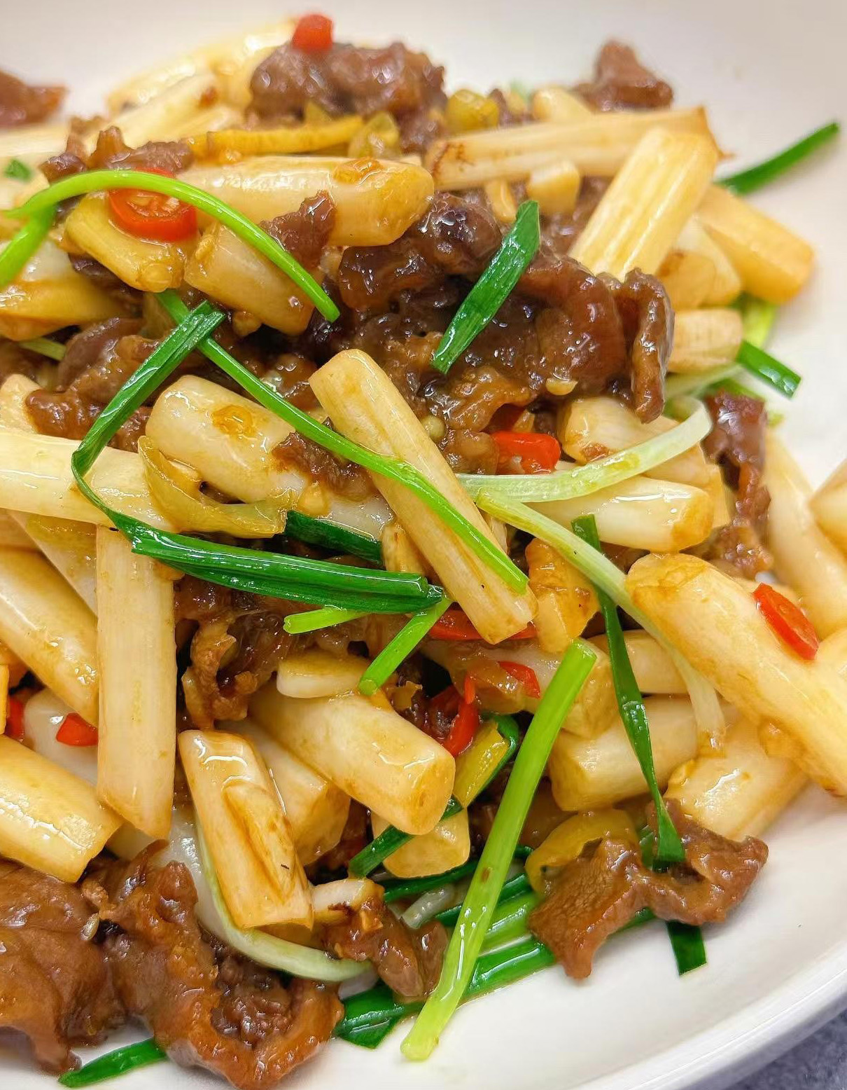 倒入牛肉回锅翻炒,加葱段、适量盐糖调味,炒匀就出锅高钾低脂,补钾又清肝火,中老年人爱吃,春天餐桌少不了~